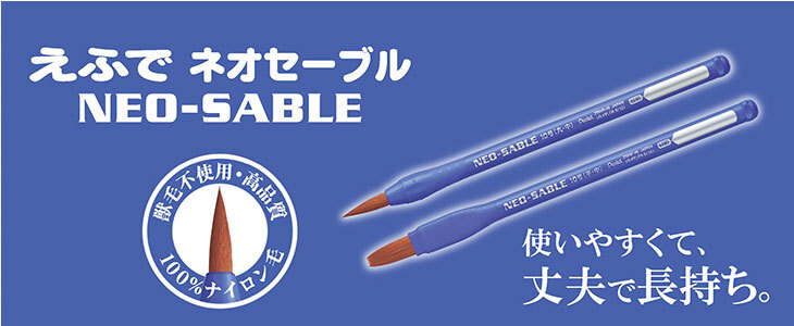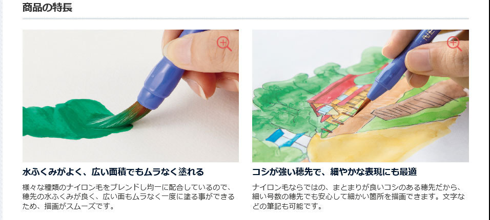 様々な種類のナイロン毛をブレンドし均一に配合しているので、穂先の水ふくみが良く、広い面もムラなく一度に塗る事ができるため、描画がスムーズです。
