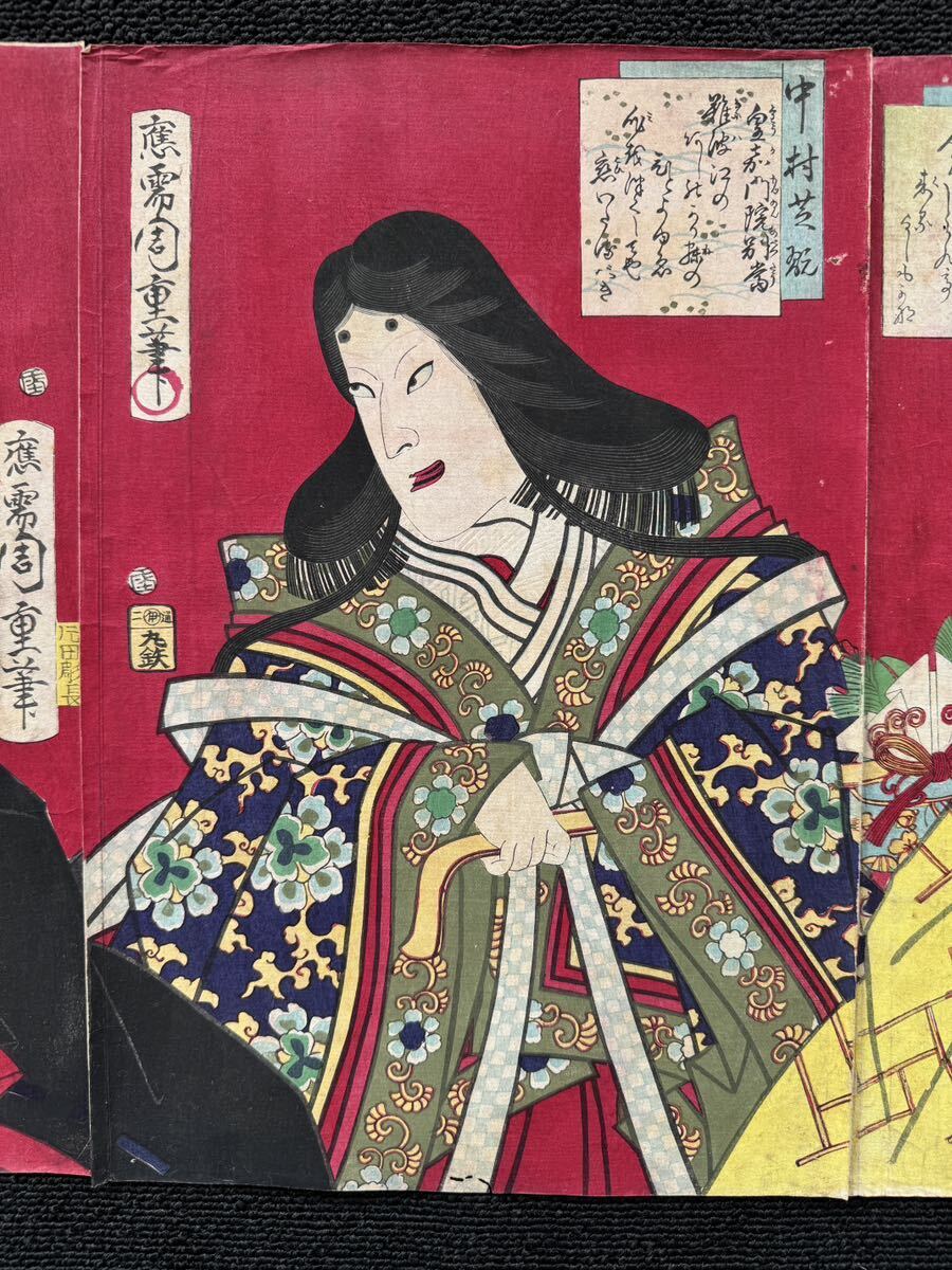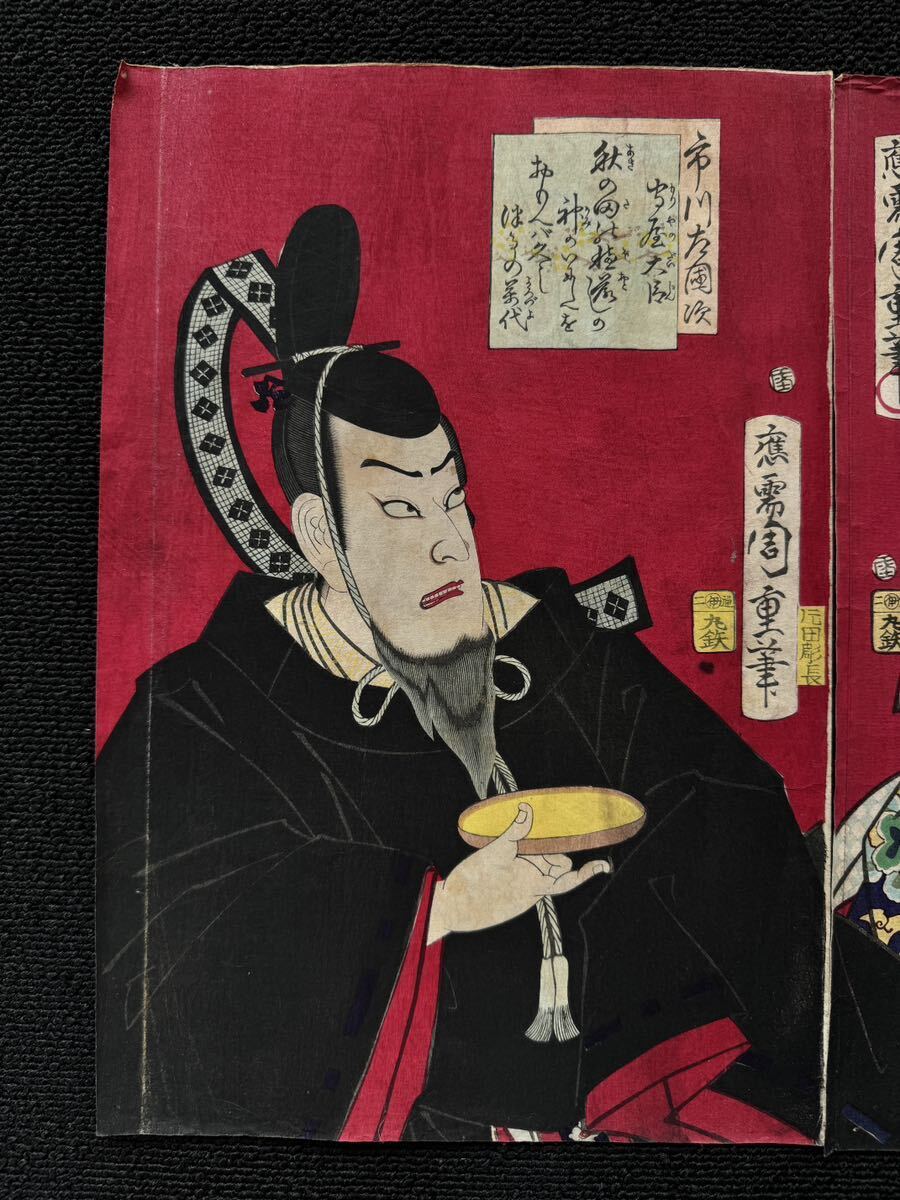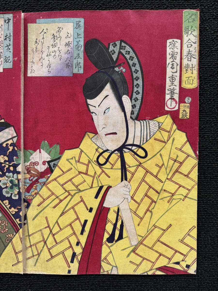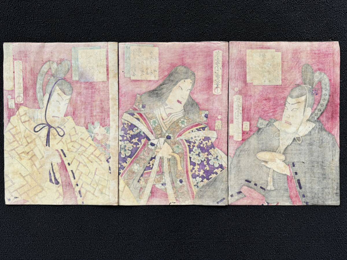 明治期/真作 守川周重「名歌合春對面」本物浮世絵木版画 歌舞伎絵 役者絵 芝居絵 錦絵 大判 三枚続き