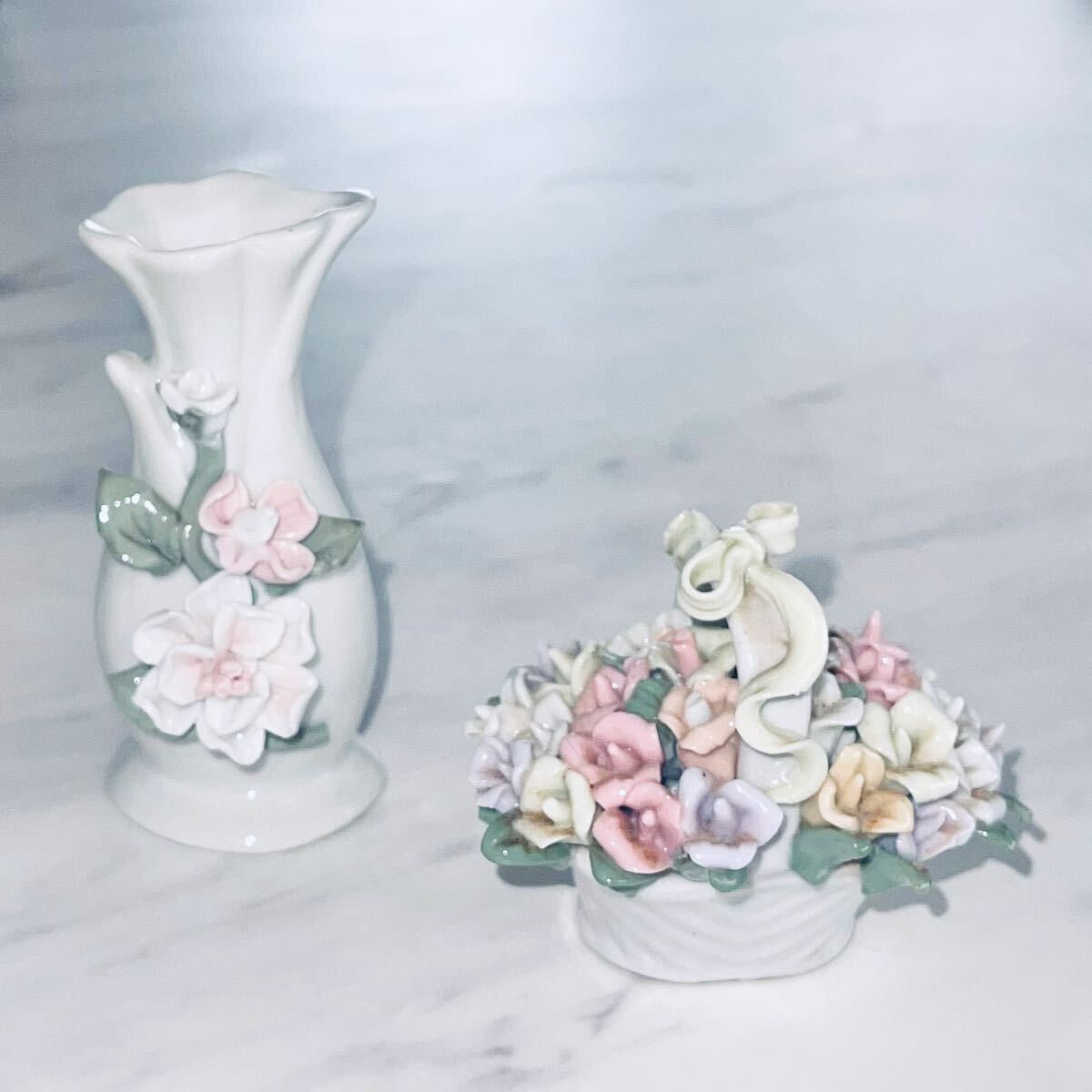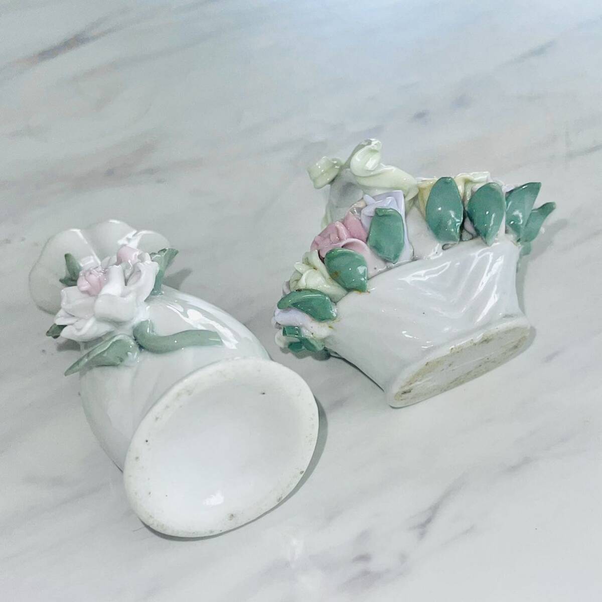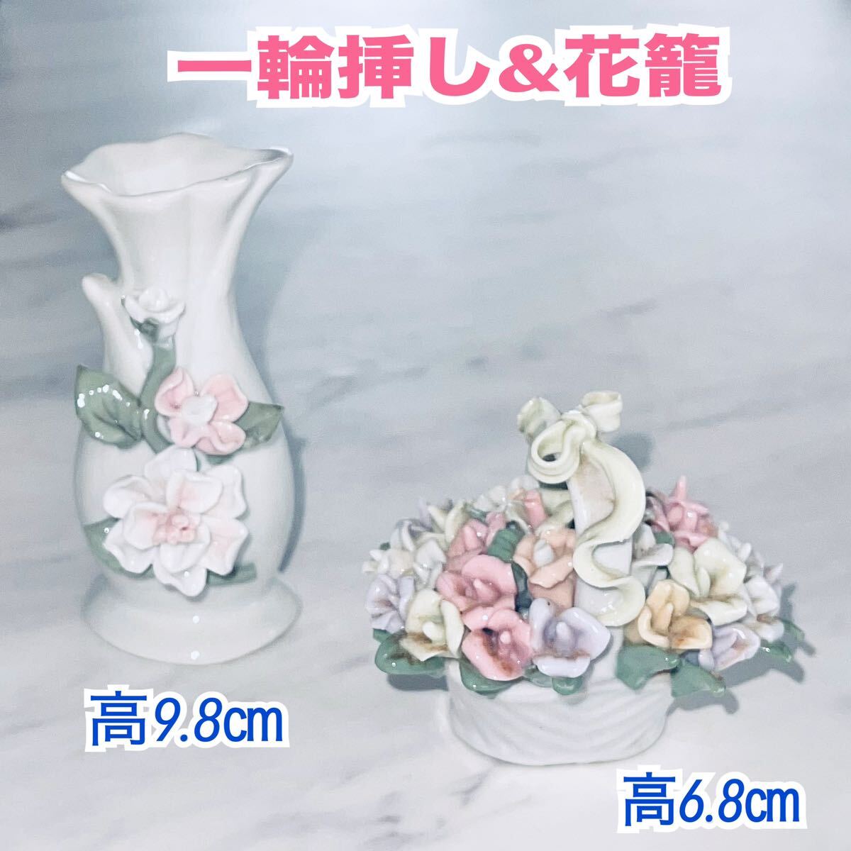 真っ白の陶器にパステルカラーの薔薇彫刻が可愛い、一輪挿し&花籠のセットです。