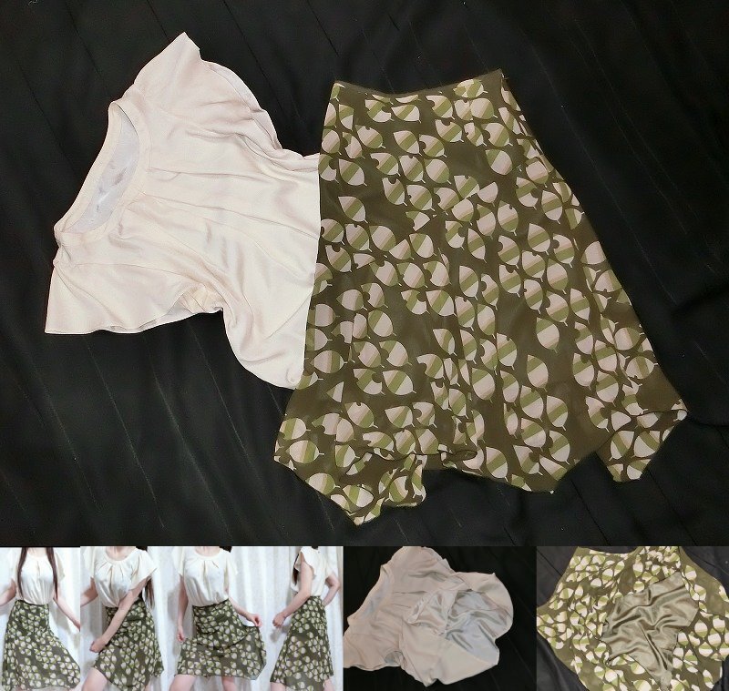 J4★大人美人スタイルコーディネート セット★少し光沢カットソー&フレア グリーン系