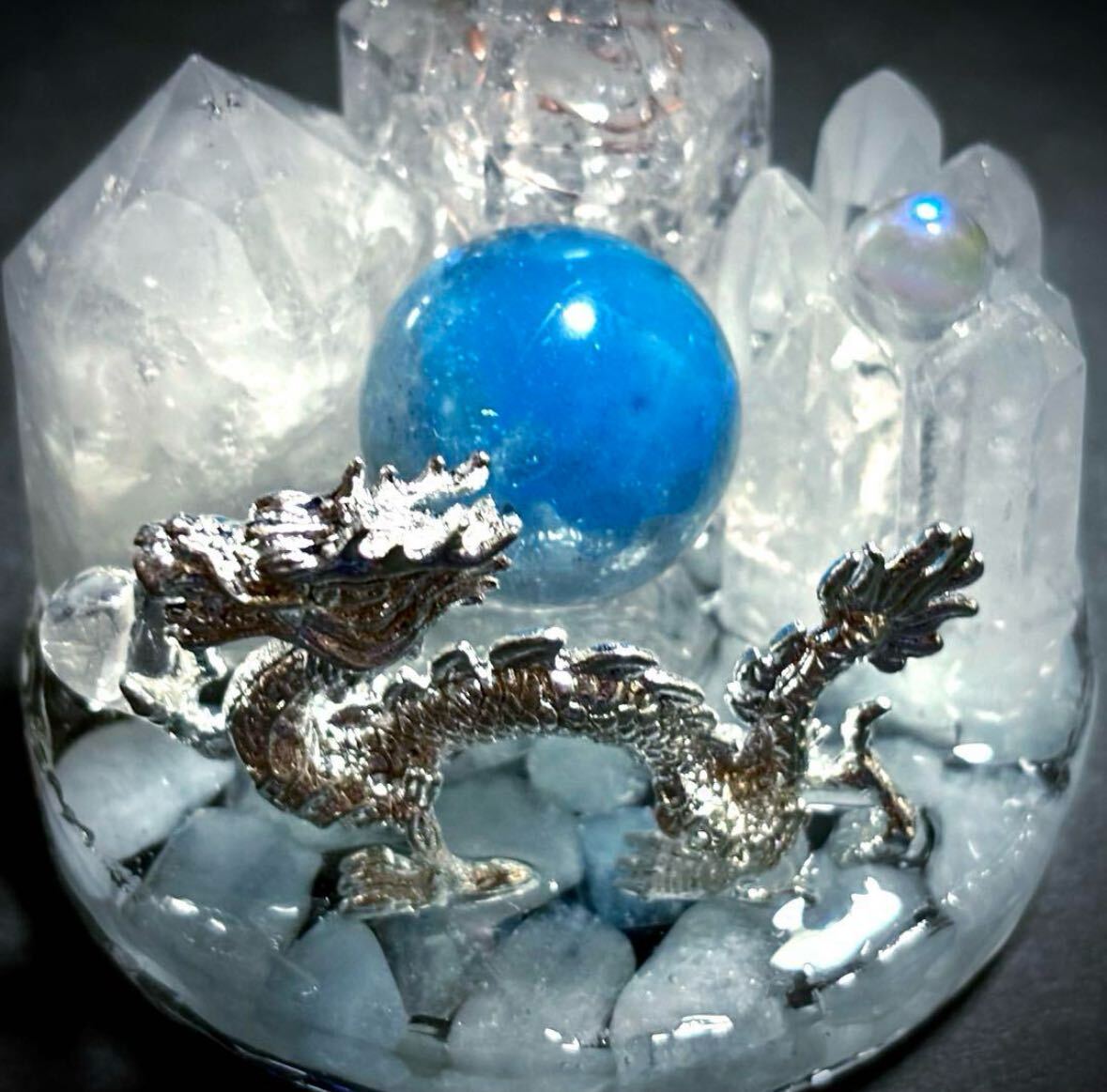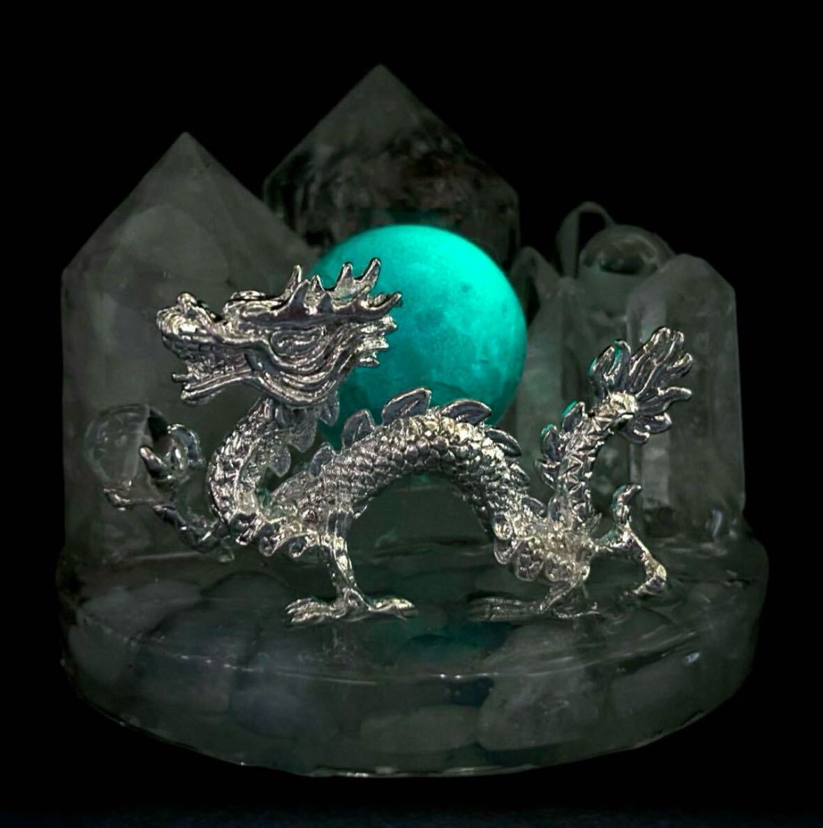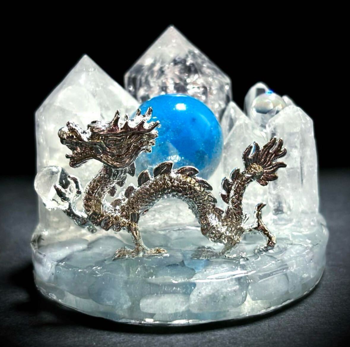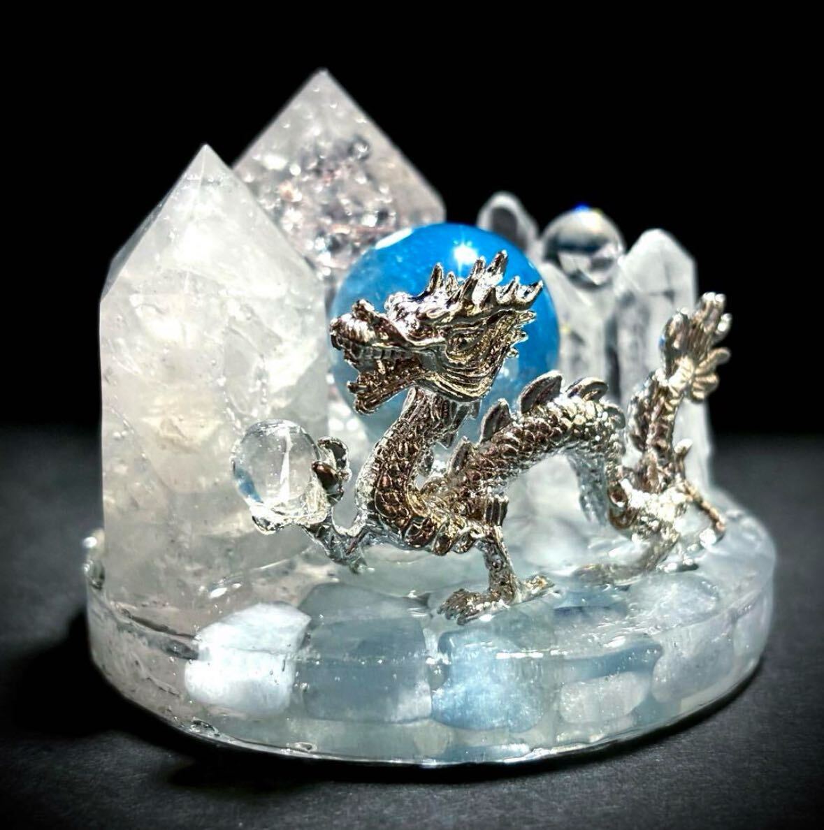 宝水晶を掴む銀の龍が舞っています