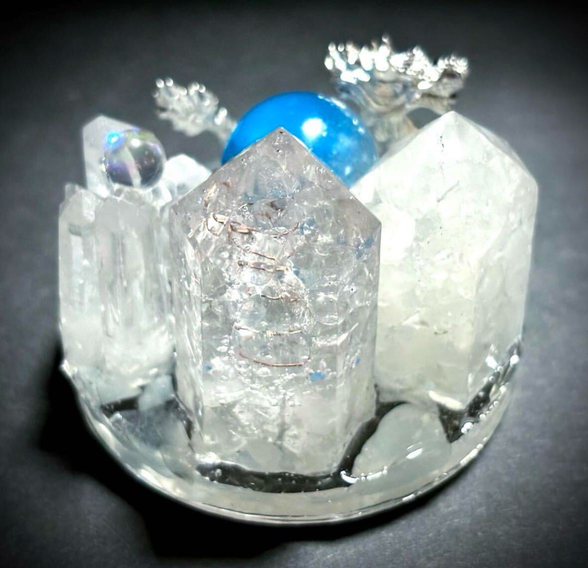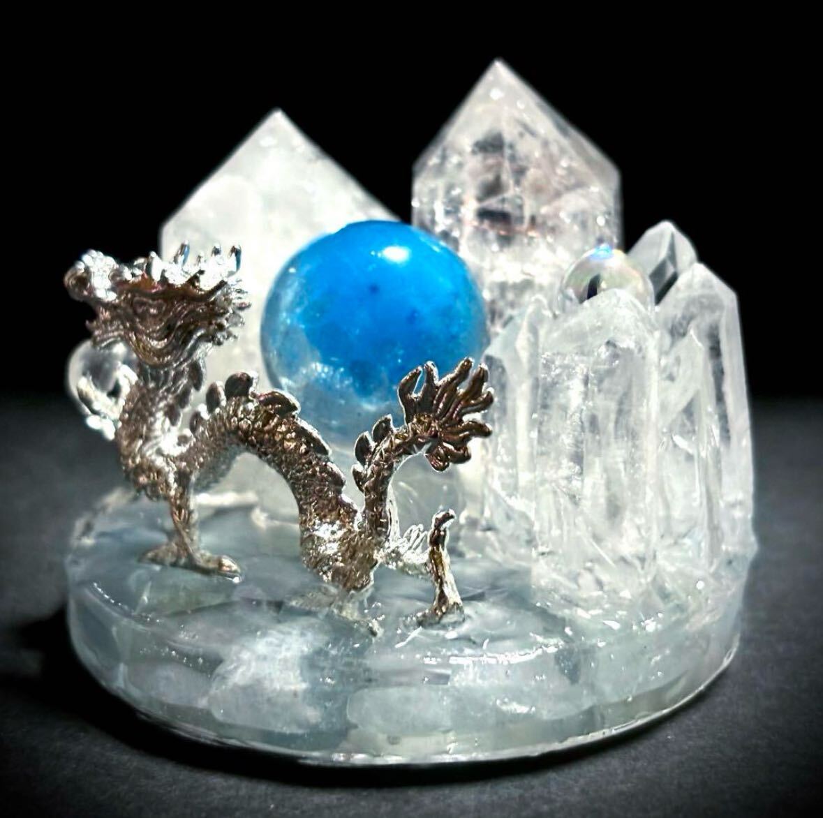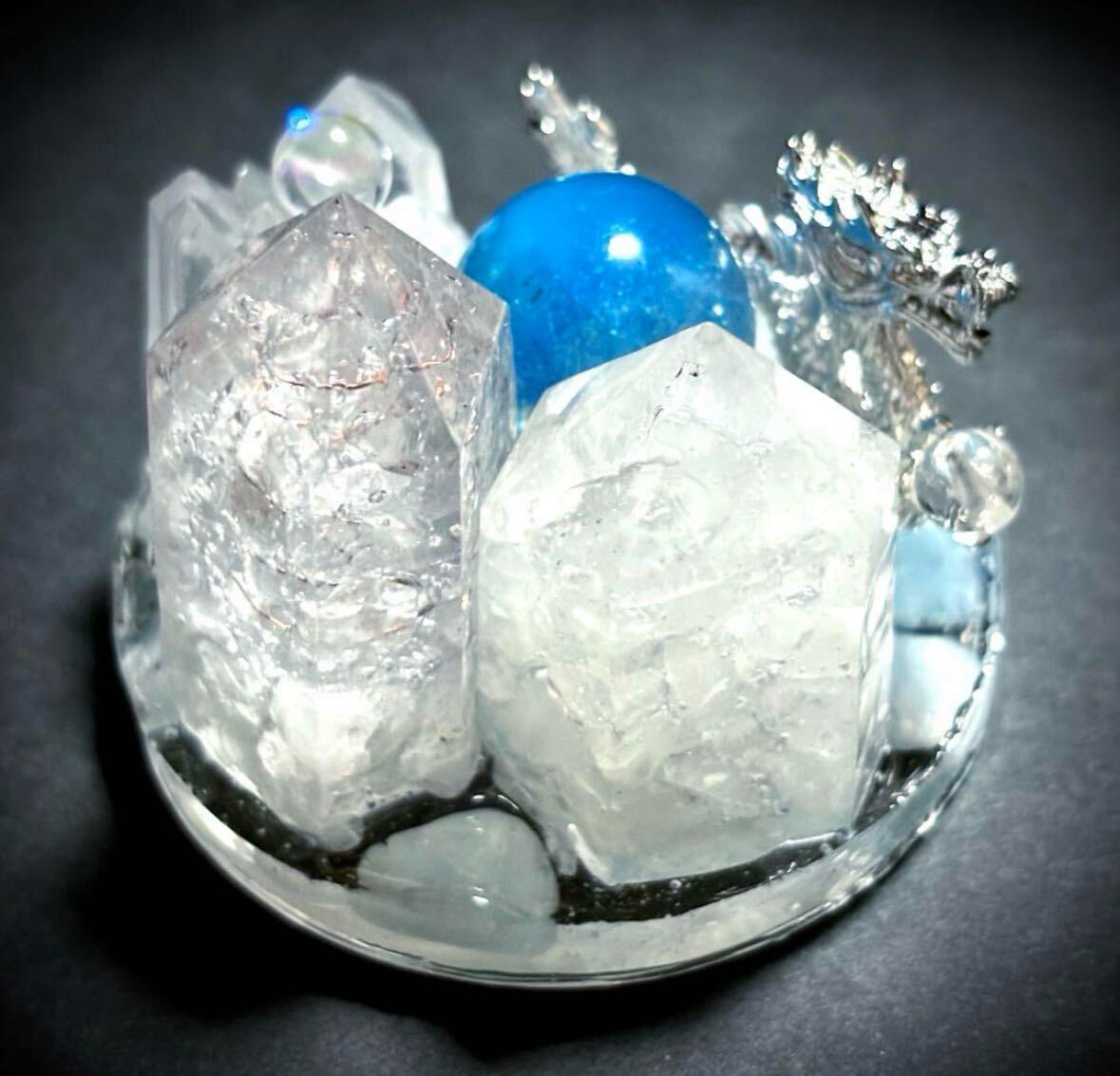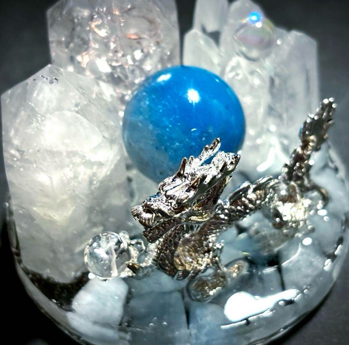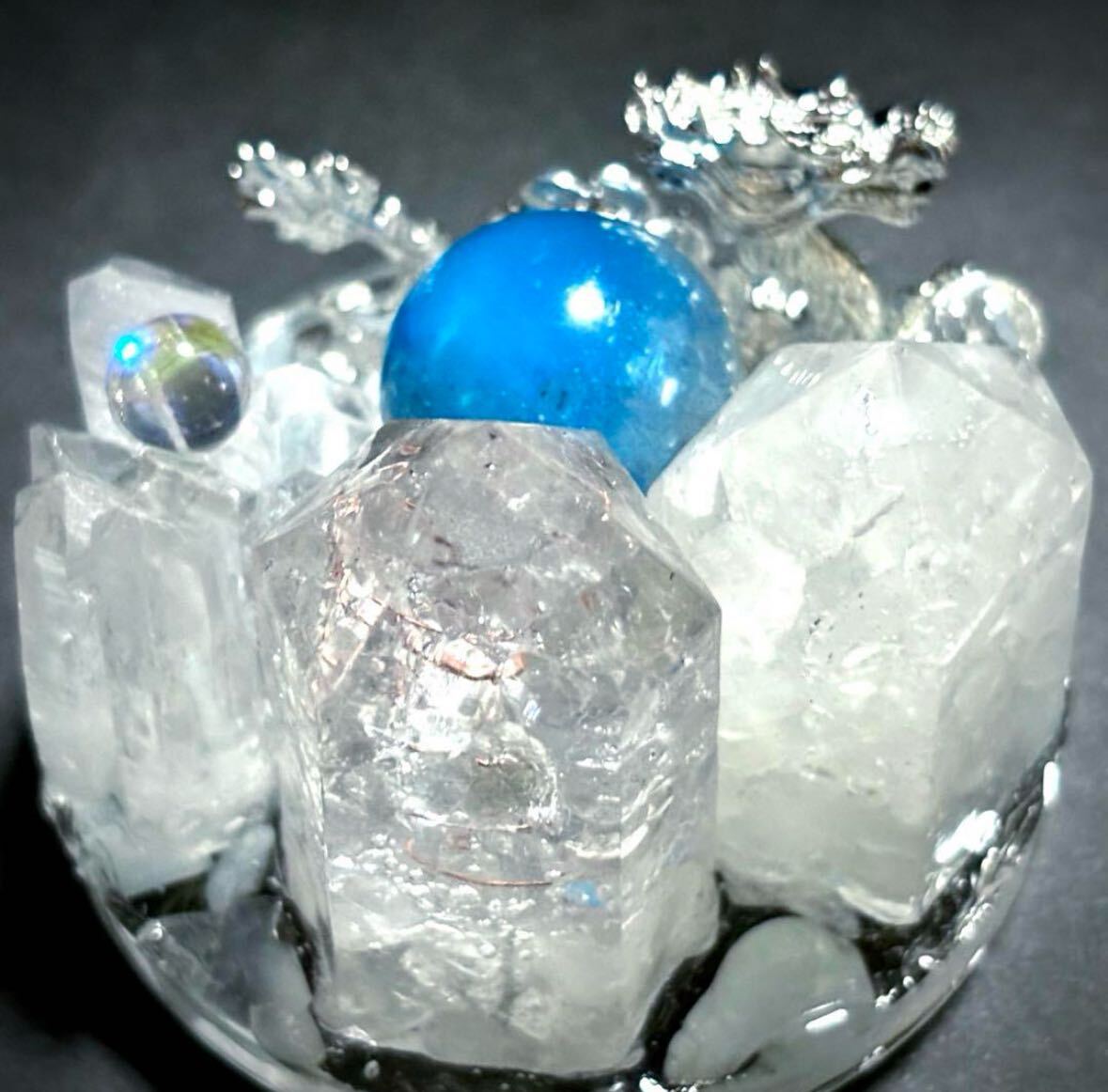 宝水晶を掴む銀の龍が舞っています
