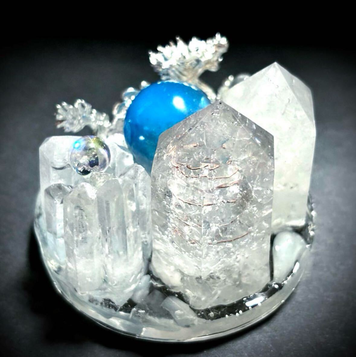 六角オルゴナイトの封入物は水晶ポイント、2種類のヒマラヤ水晶、銅線です