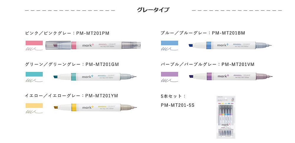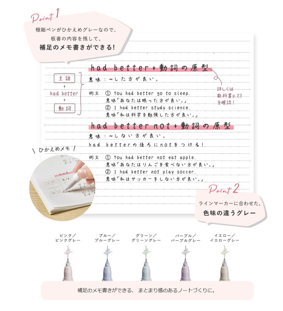 ●「めだたせカラー」はチカチカしにくいインク色を採用しているので、文字の上からのマーキングに適しており、「ひかえめメモ」はグレー色の極細ペンで、ちょっとした情報のメモに適しています。