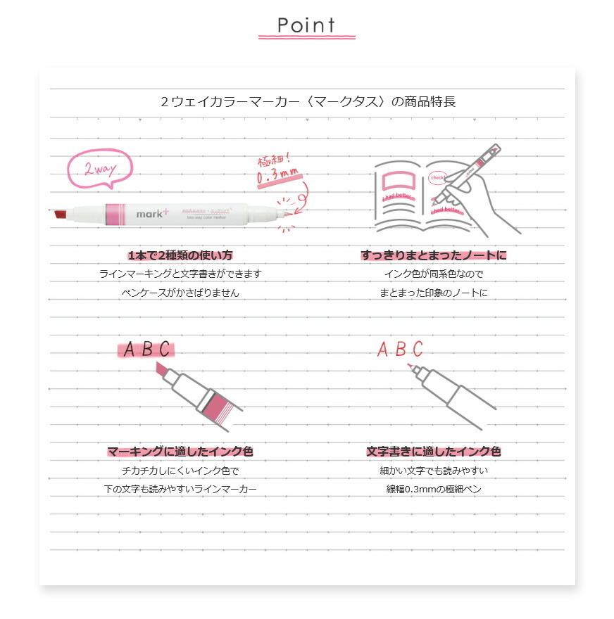 ●1本で2種類のマーキングができるので、ペンケースがかさばりません。