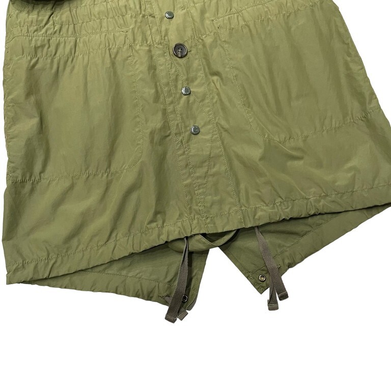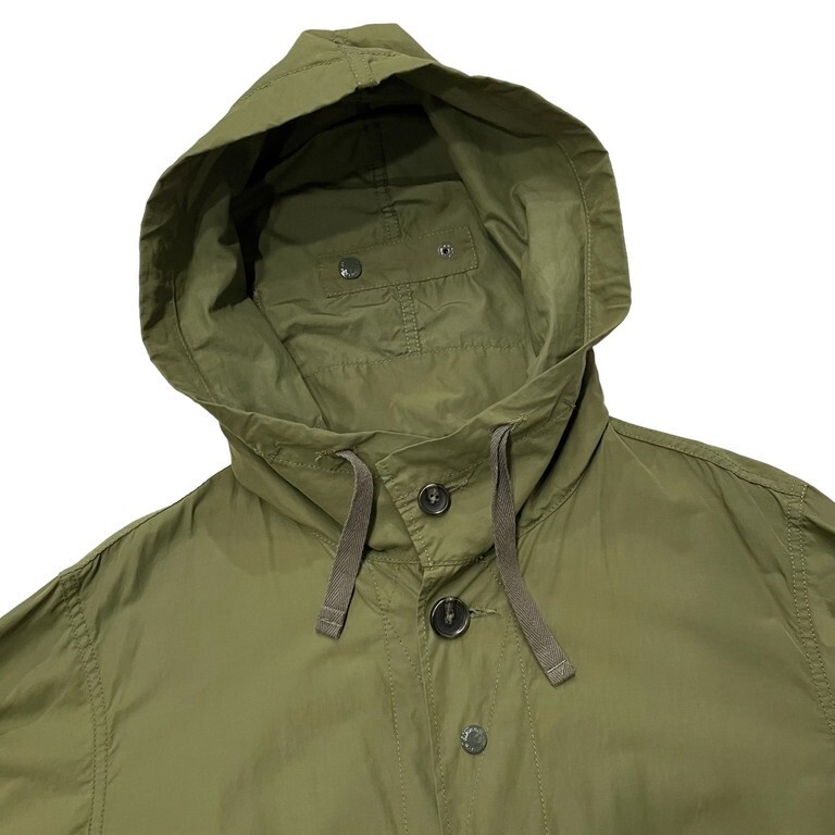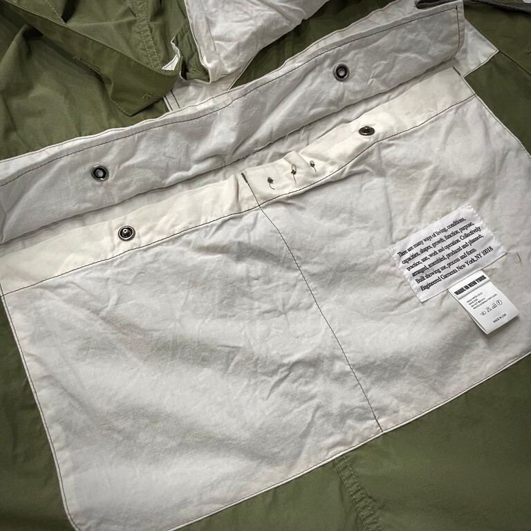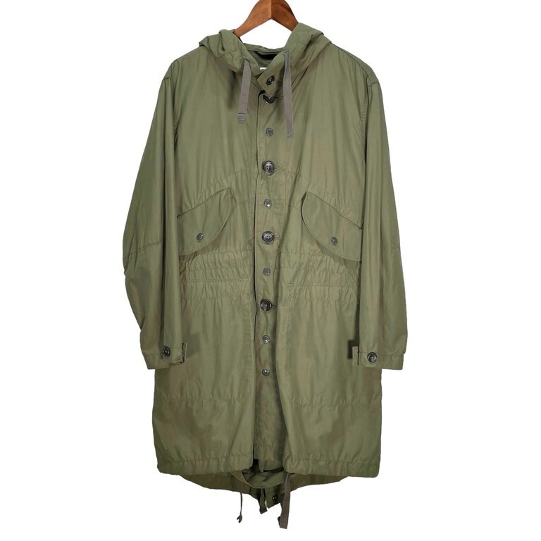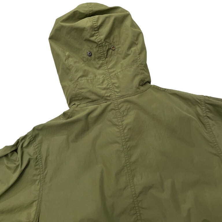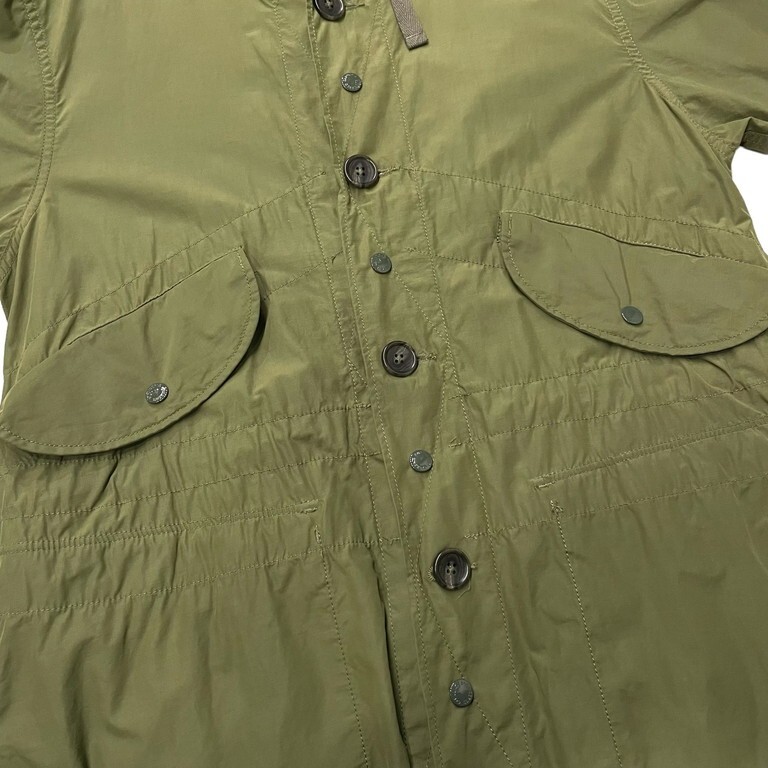 STAFF COMMENT | Engineered Garments HIGHLAND PARKAです。エンジニアガーメンツの定番アイテムとなっており、こちらはコットンとナイロンの混紡素材のモデルとなっております。コットンナイロンでよりパきっとした光沢感のあるミリタリーウエアらしい仕上がりとなっており、エンジニアガーメンツらしく細部まで練られたデザイン。フロントはボタンとスナップボタンが交互に取り付けられ、男らしくゴツゴツとしたモッズコートをマイルドな印象に。袖口にはボタンを3段階配置しており自由に袖口を絞ることも可能です。フロントポケットは腹部に2つ付いてるだけとなっていますが、何と言ってもこちらのモデルは内部に大きめのポケットが計4つございます。収納力も兼ね備えた優れものとなっております。ショルダーストラップも付いておりシーンごとに分けてお使い頂けます。若干の使用感はあるかと思いますが、目立った傷や汚れもなくまだまだお使いいただけます。 |