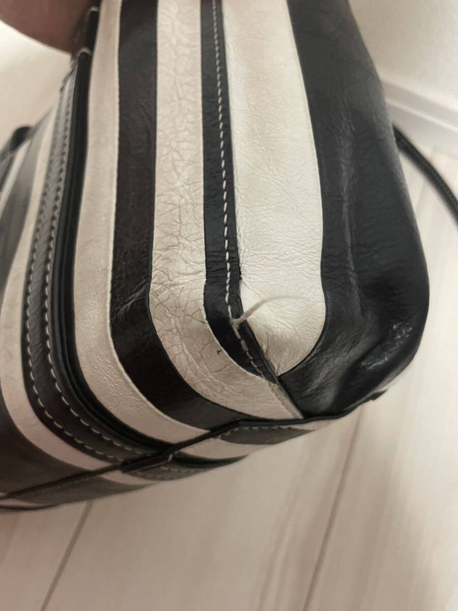 取っ手部分の型崩れ、全体的なくすみ、カドすれ(紐ほつれ1か所)など、それなりに使用感のある商品です。パッと見は綺麗なので、まだまだご利用いただけると思います。感じ方は人それぞれですので、画像を参考にしてください。