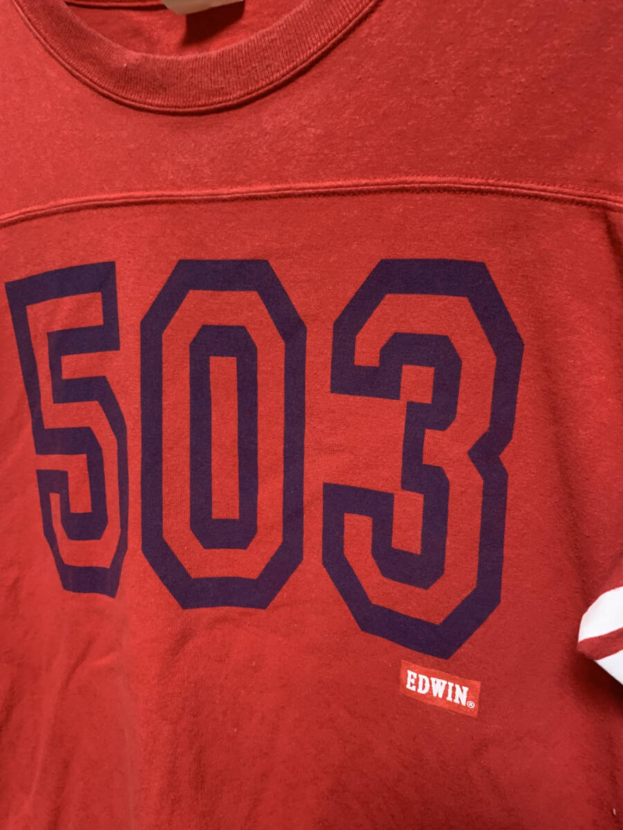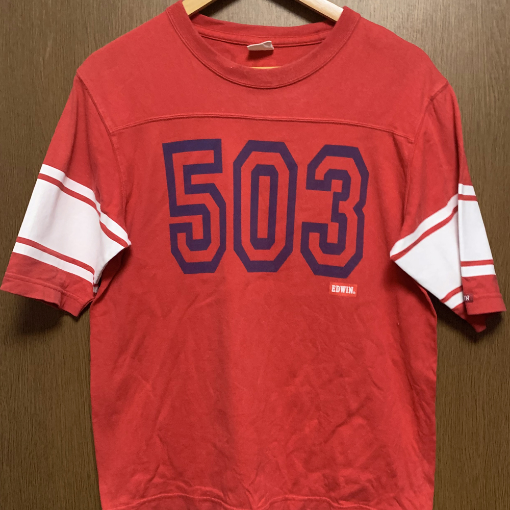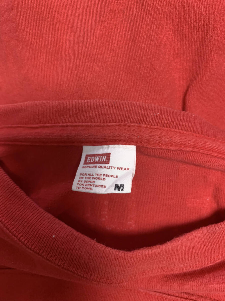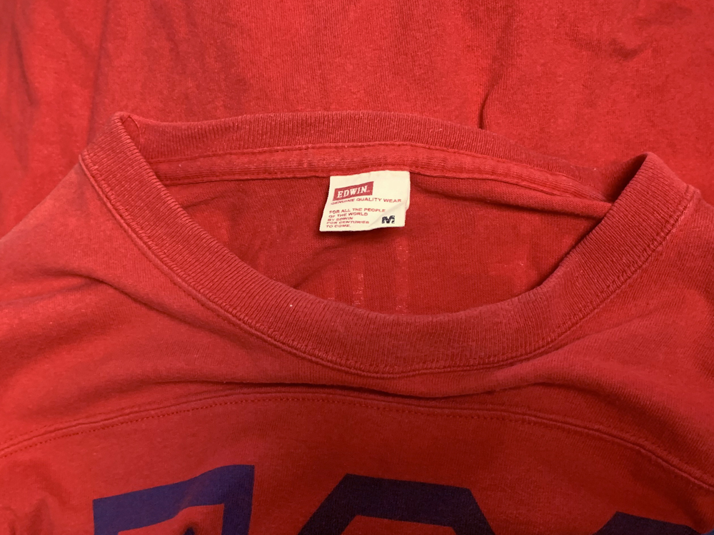 M EDWIN|エドウィン 半袖Tシャツ レッド ホワイトプリント袖 503 BLUE DENIMES