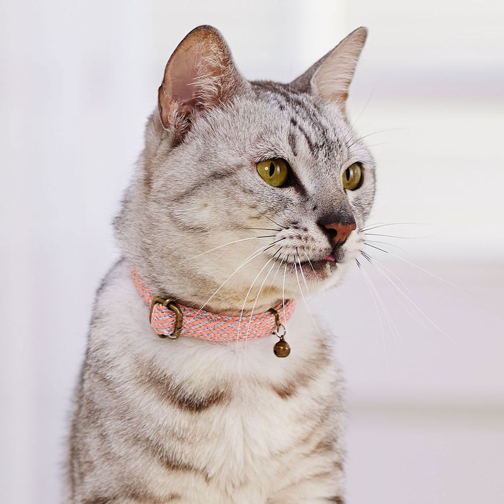 ライトに反射して光る全猫種対応の猫首輪です。抗菌加工を施した生地を使用し、調節具や鈴にはアンティーク調のおしゃれなパーツを採用しました。鈴付き。