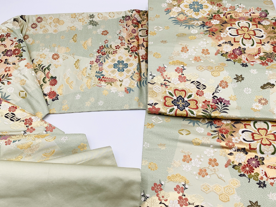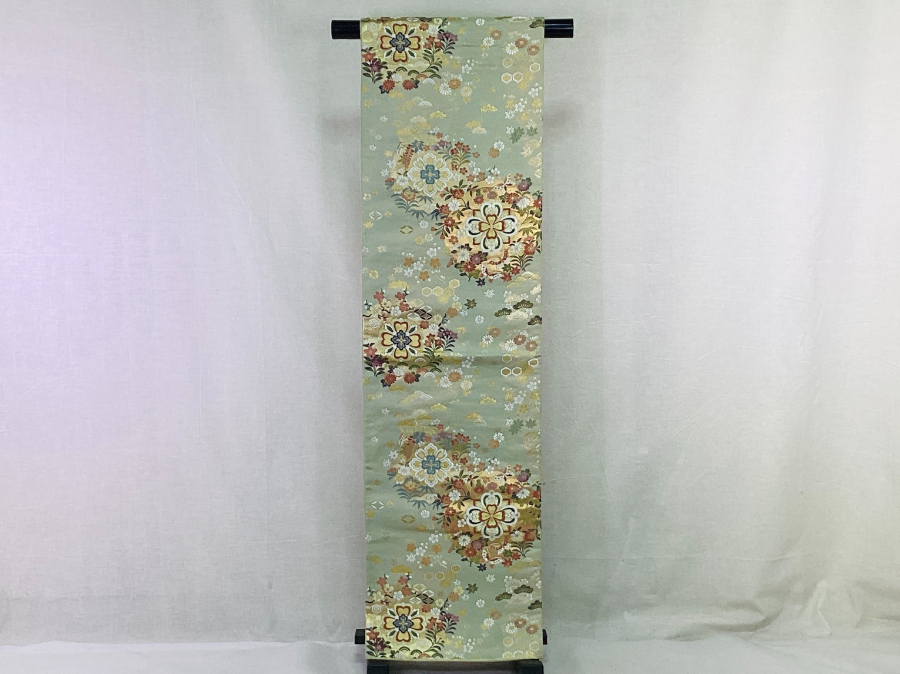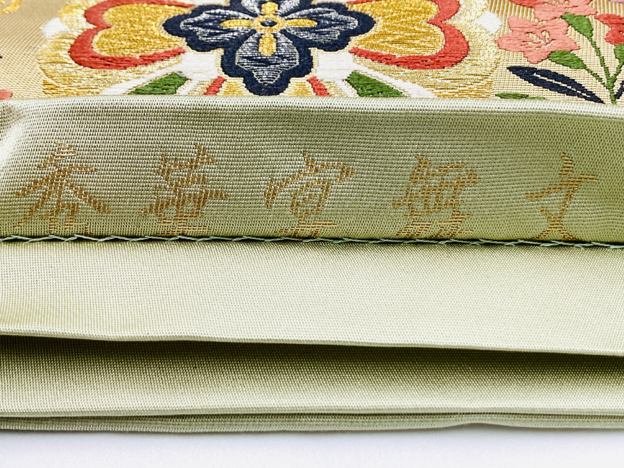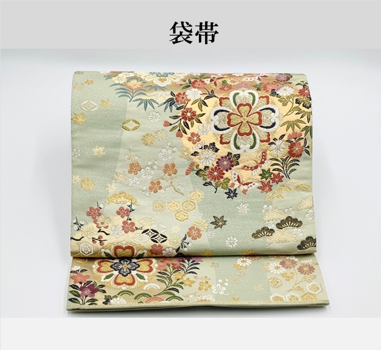 コメント | 未使用の正絹お仕立て上がり袋帯です。 地紋織生地に引箔六通柄お品物です。 特に目立つシミ汚れない綺麗な品物です。 |