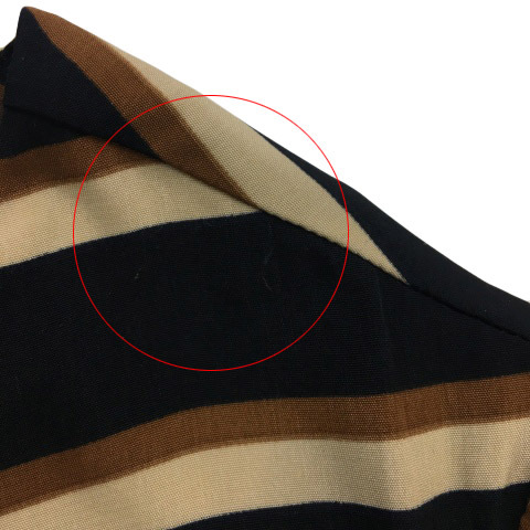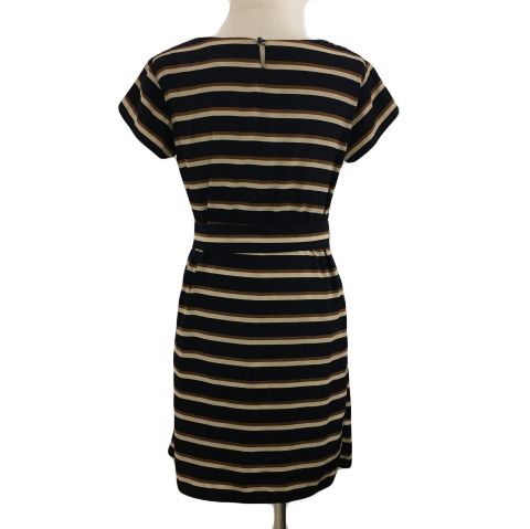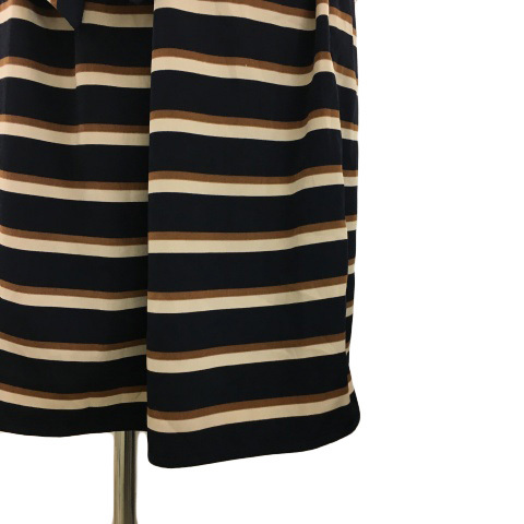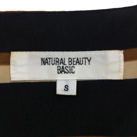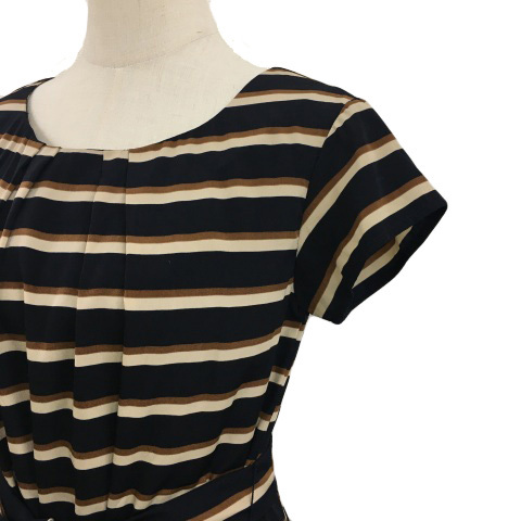 ナチュラルビューティーベーシック ワンピース Iライン ミニ リボンベルト ボーダー タック 半袖 S 黒 茶 ブラック ブラウン レディース