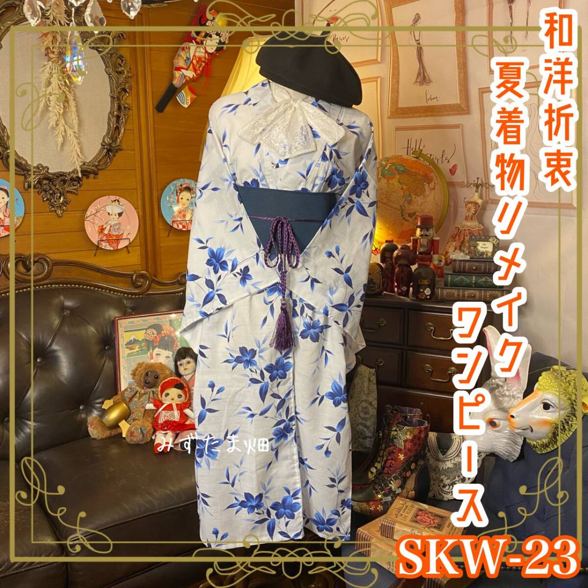 【 和洋折衷 夏着物リメイク ワンピース ドレス 夏帯サッシュベルト レトロ 古着 和 モダン 青/ブルー×白/ホワイト系 SKW-23】