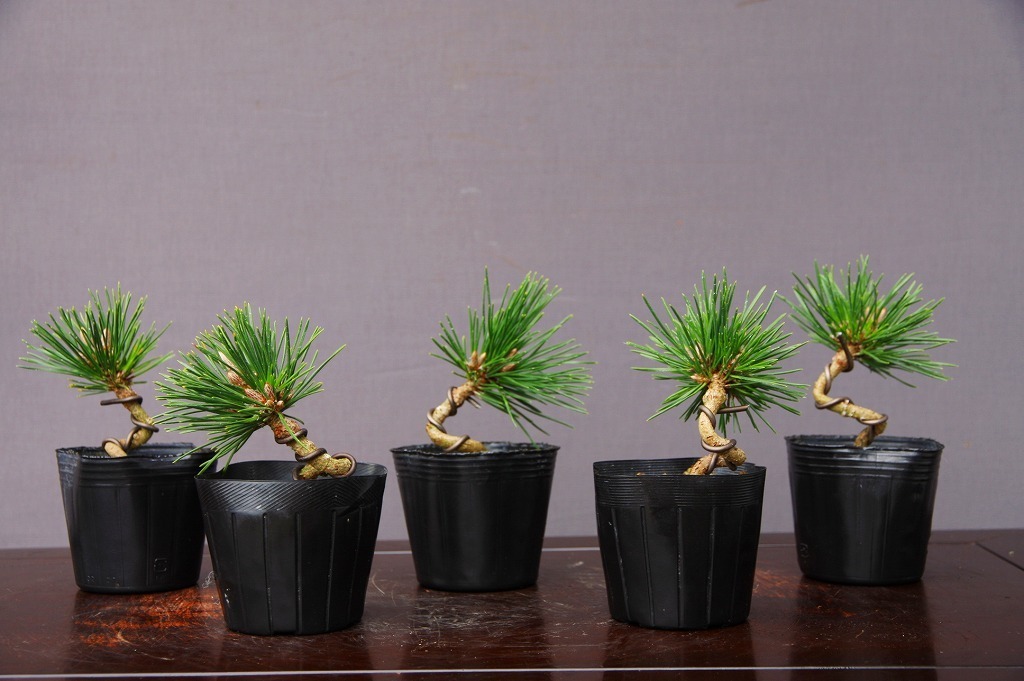 | 説 明 | 千寿丸5本セットでの出品です。寿松の枝変わりを接いだもので、葉は更に短い八房性になります。黒松より緑が濃く、短く太くしっかりしており、芽切りをする必要なく、胴吹き旺盛で枝作りの早い樹です。この樹は幹に大きく曲を入れ、低い小品盆栽に仕立てるよう基礎を作ってあります。銅吹きも旺盛ですので、幹から吹いた芽を枝に仕立てていけば、模様木として仕立てて行けます。作る楽しみのある素材です。 |