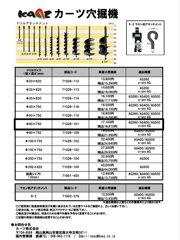 未使用 カーツ部品 オーガ― 穴掘機 ドリルアタッチメント Φ60×750 71026-101 未使用になります。 適応機種AG260 AG400 AG500 です。発送はゆうパックです。詳細は2枚目、メーカーページを確認ください。