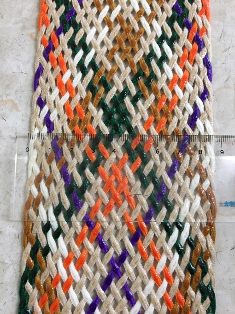 数色に染色したアクリルの紐を33本使用して製紐機で組み上げ、特殊な液を使い艶出しを施した大変凝った商品となっております。
