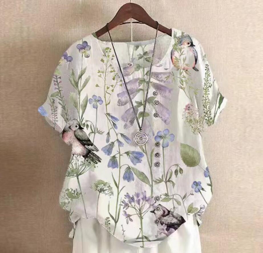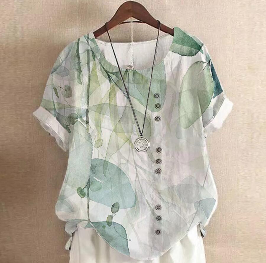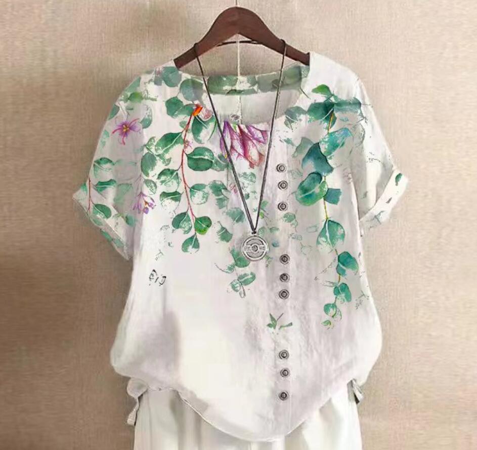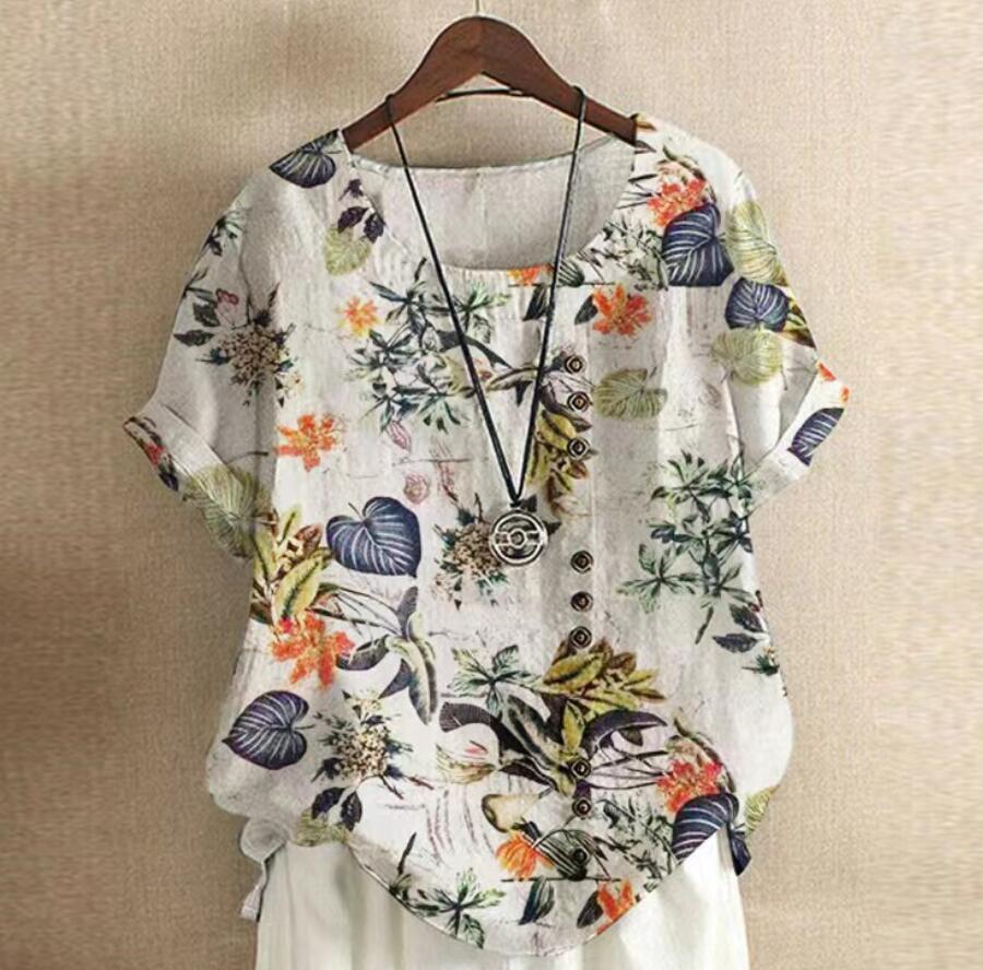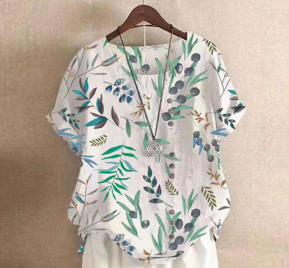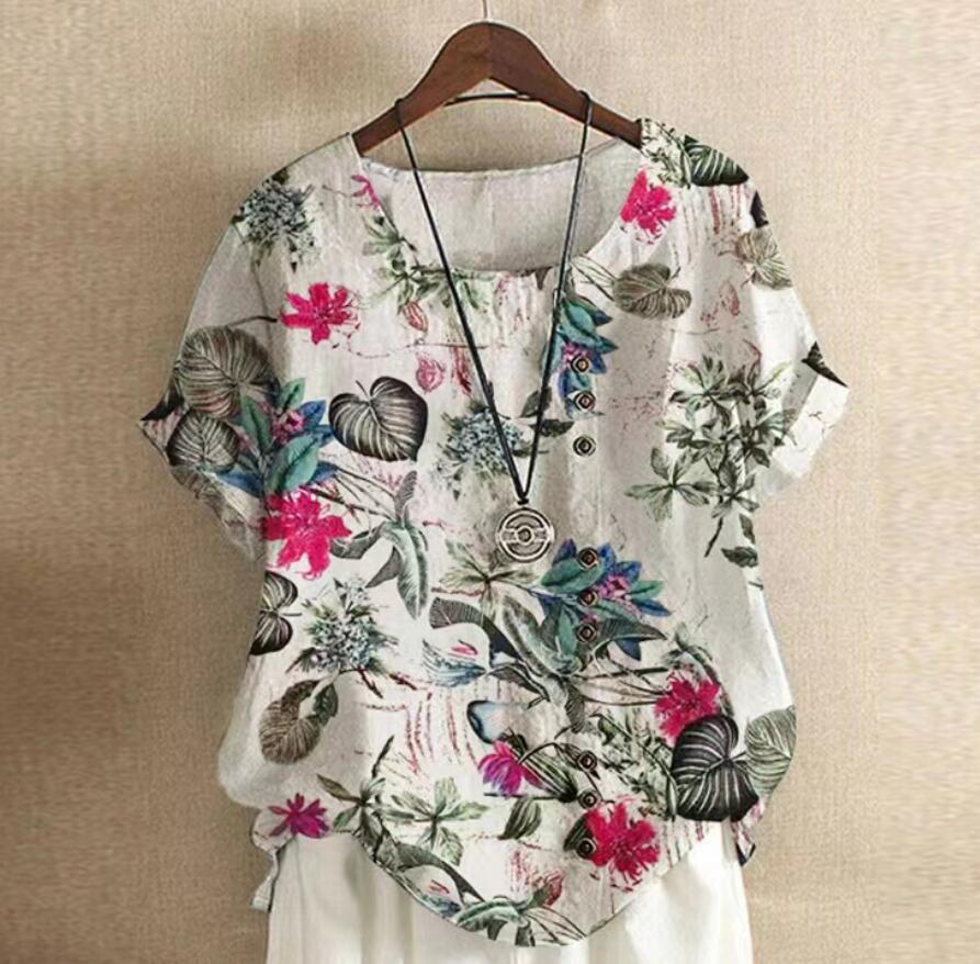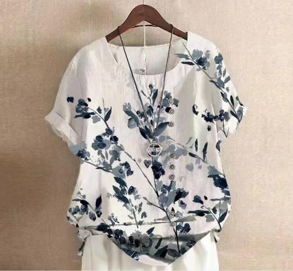 新入荷/夏新作 リネンシャツ 綿麻ブラウス レディース 薄型 綿麻 半袖Tシャツ トップス プリント柄 体型カバー ゆったり 01