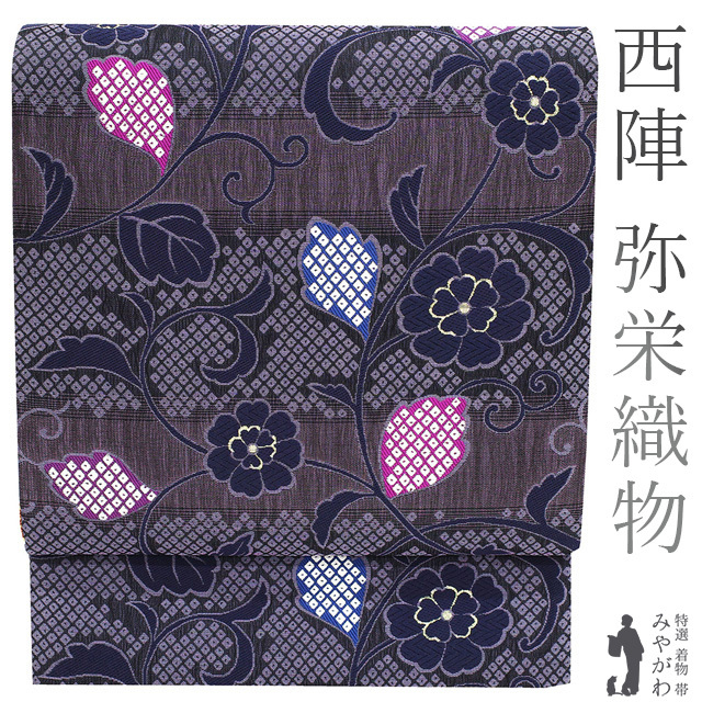 袋帯 京都 西陣 弥栄織物 軽量織 正絹 金箔糸 紫 黒 花唐草 春 秋 冬 スリーシーズン カジュアル 新古品 仕立て上がり みやがわ sb52626