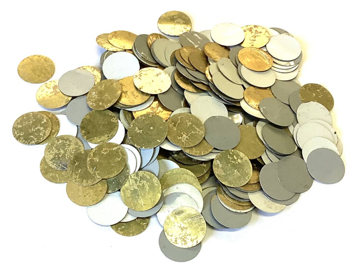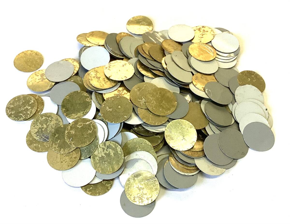 | 入札前に説明文を最後までお読みになってからご入札ください。 未使用・長期保管品となります。 サイズ:外径 約16mm 厚さ 約0.2mm 材質分かりません(樹脂製だと思います。) 磁石はくっつきませんでした。 片面に金メッキか真鍮メッキがしてあります。 腐食が進んでいるのか表面がザラザラしております。 仕様用途がわかりません。 約350枚あります。 捨てるのも もったいないので 芸術作品などに使用される方にお譲りします。 |