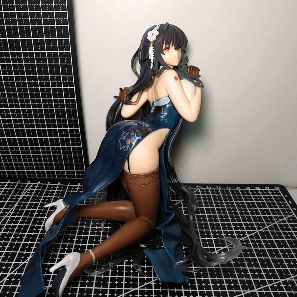 このフィギュアは、アズールレーンのキャラクター「吾妻」が、濃紺のチャイナ服にニーハイを合わせた姿で表現されています。このスタイリッシュな衣装が、彼女の魅力を一層引き立てています。