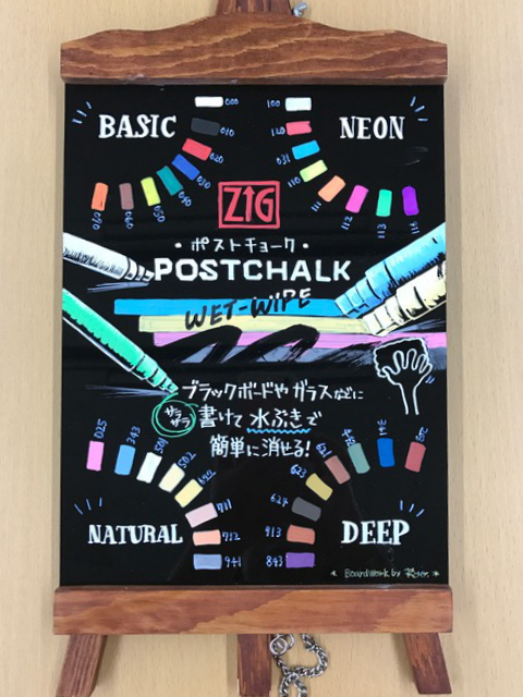 ZIG POSTCHALK マーカーは「水性顔料」タイプのインクを採用しています。隠蔽性(いんぺいせい)が高く、ブラックボードのような色の濃い筆記面に上から描いても、綺麗に発色します。