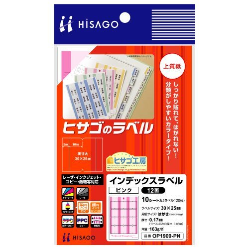 | ◆プリンタを選ばない! 分類がしやすいカラータイプ! ◆ボールペン、鉛筆、水性・油性ペンなどの筆記具での書き込みにも適しています。◆しっかり貼れる強粘着のノリを使用しています。 / ■ 仕様 ■対応プリンタ:インクジェット、レーザー、コピー、熱転写1シートの面付数:12用紙サイズ:ハガキ(100×148mm)1片サイズ:30×25mm用紙種類:上質紙厚み:0.17mm坪量:163g/m2程度入数:10シート / ※表示されている厚さ・坪量はサンプル値ですので目安としてお考えください。※ご使用の前に、プリンタ・コピー機の取扱説明書で使用できる用紙の厚さ・坪量を必ずご確認の上、ご使用ください。 |