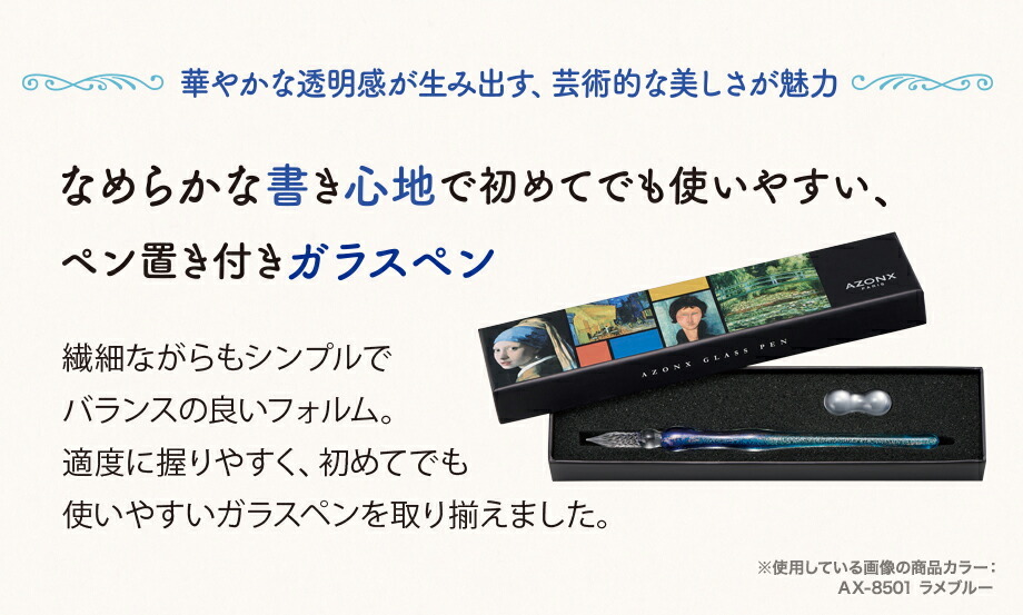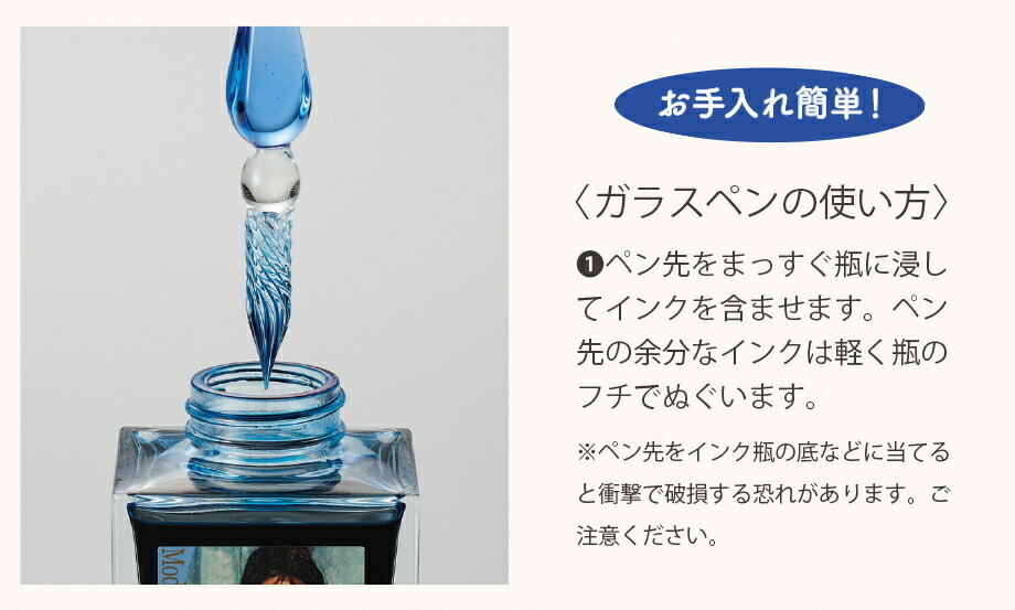 ●なめらかな書き心地で初めてでも使いやすい、ペン置き付きガラスペン。