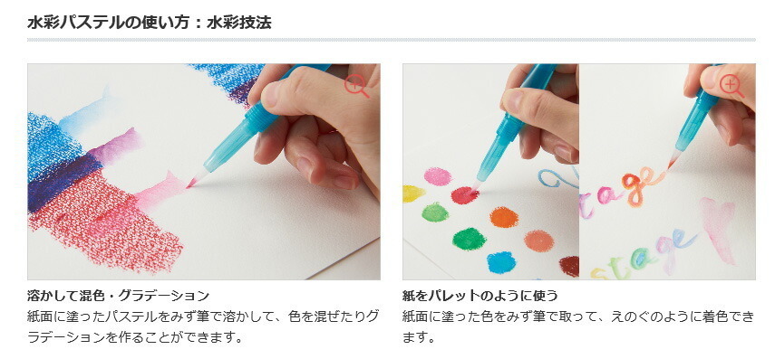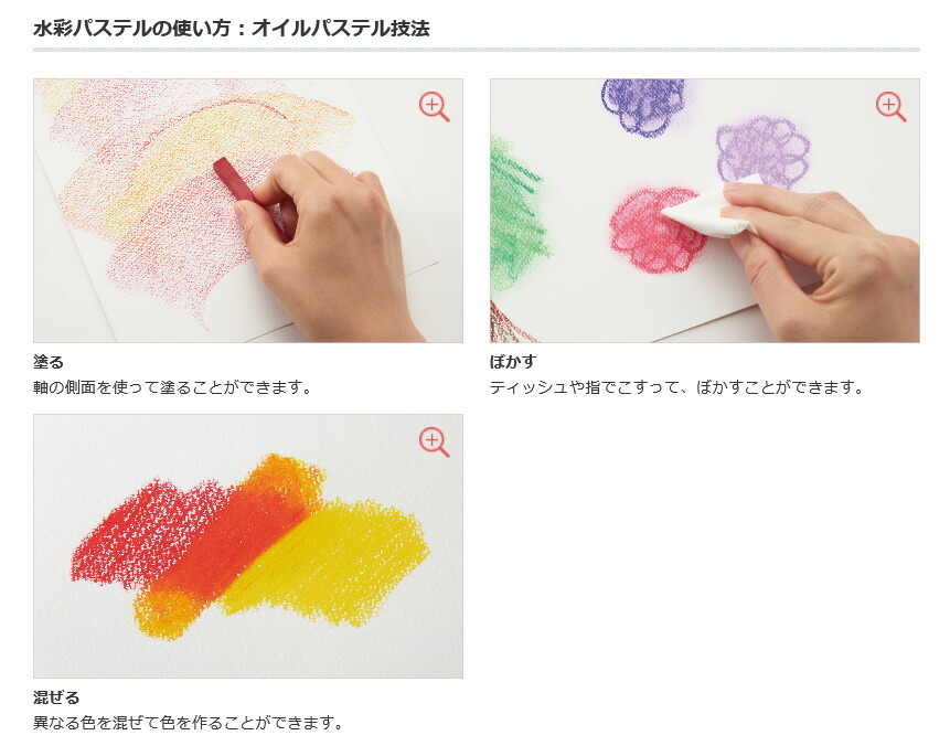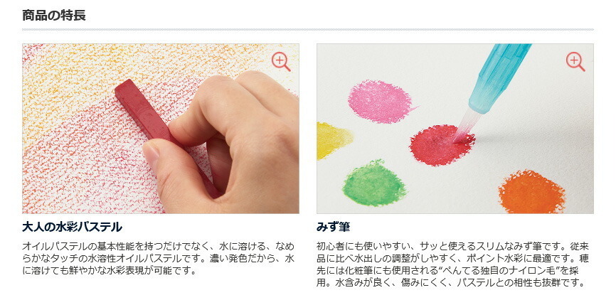 オイルパステルの基本性能を持つだけでなく、水に溶ける、なめらかなタッチの水溶性オイルパステルです。濃い発色だから、水に溶けても鮮やかな水彩表現が可能です。
