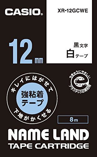 ●カシオ XR-12GCWE キレイにはがせて下地がかくせる強粘着テープ ネームランド用 白地テープ/黒文字 12.0mm●しっかり貼れる●粘着力は強粘着テープ同等。●特殊な糊なので平面でもシボ面でも剥がせるのに、しっかり貼れる!●はがしてもノリ残りがなくキレイ●剥がした後の糊残りがなく、剥がした後もきれい!●重ねて貼っても下地が透けない●テープ裏面にも加工を入れることで隠蔽性向上! 貼る先の色に影響されず、文字がしっかり読める! 文字訂正など上から貼っても下地が透けない●仕様●対応機種:ネームランド