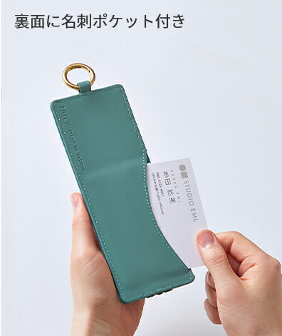 裏面には名刺・カード類を収納できる名刺ポケット付きで、予備の名刺や社員証・学生証などを収納しておけます。デザインのアクセントでもあるカラビナを使ってバッグやポーチに取り付けることもでき、シーンに合わせて自由に使えます。