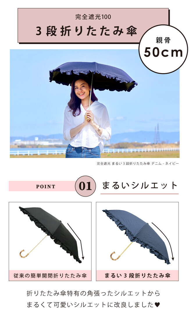 【丸いシルエットの完全遮光薄型3段折りたたみ傘】
