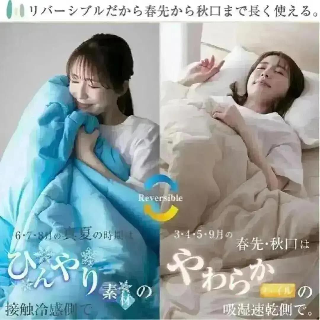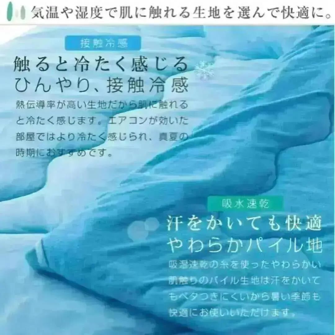 リバーシブルで春先から秋口まで長く使えます:接触冷感面:熱伝導率が高い生地なので、肌に触れるとひんやりと感じます。エアコンの効いたお部屋でも涼しく感じられ、真夏にもおすすめです。やわらかパイル面:吸湿速乾糸を使用したパイル生地なので、汗をかいてもベタつきにくく、暑い季節も快適にお使いいただけます。