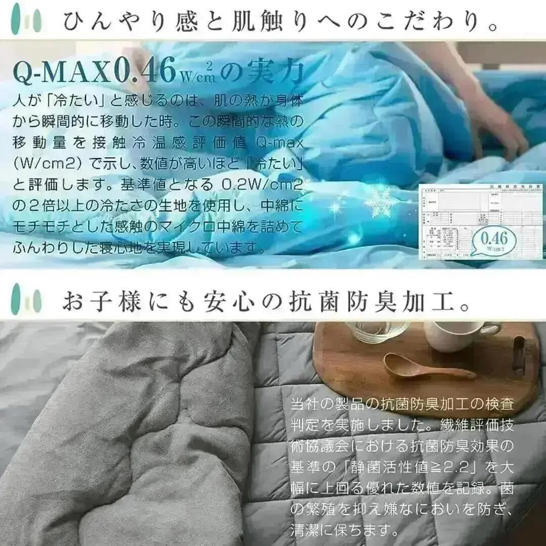 【Q-MAX 0.46W/cm2】基準値0.2W/cm2の2倍以上の冷感生地を使用し、中綿にはマイクロ中綿を封入しふかふかの寝心地を実現