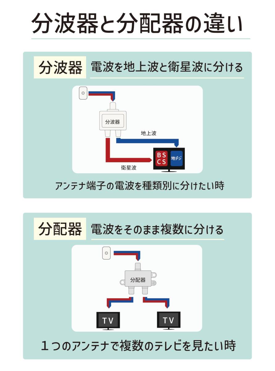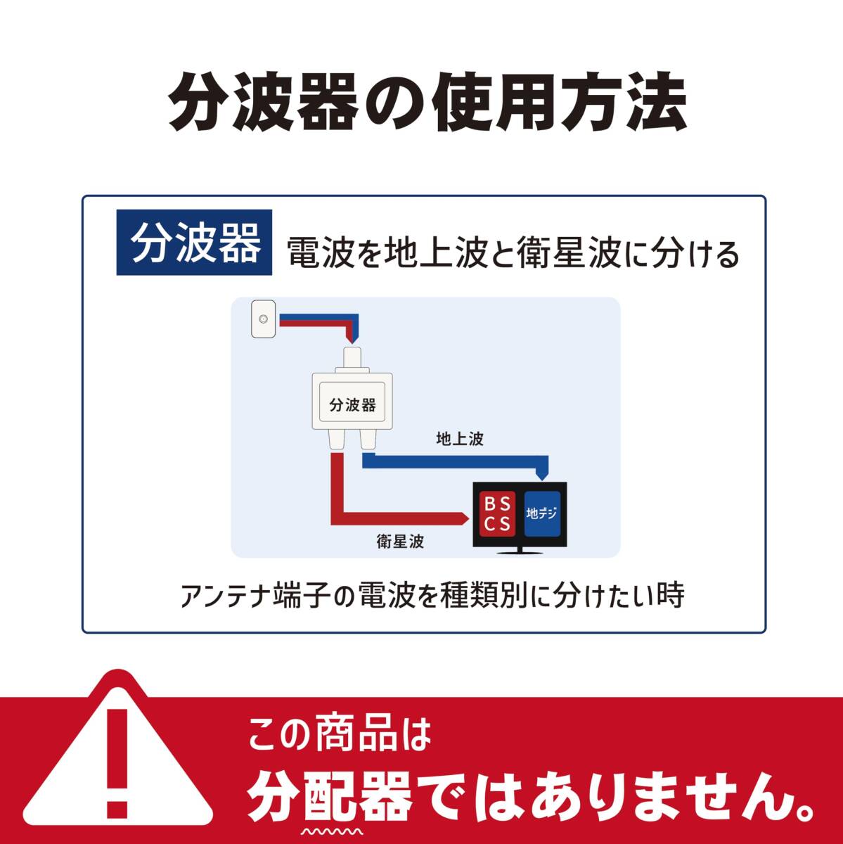 BSとCSの分波及び混合には使えません。屋内専用商品です。分配器ではありません。簡易パッケージになります。