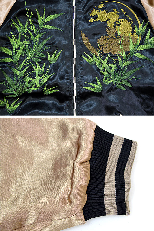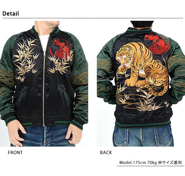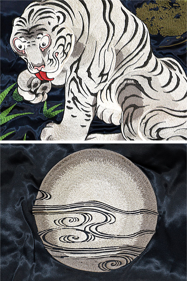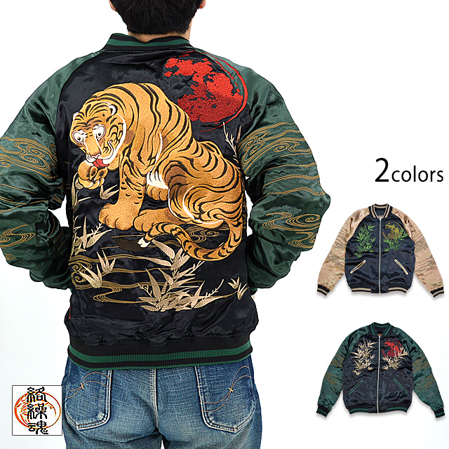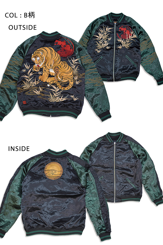 絡繰魂さんから「粋・虎図若冲浮世絵リバーシブルスカジャン(232030)」のご紹介です。 重みを感じる程の刺繍量が魅力的な絡繰魂から、最新作のスカジャンが登場しました。 今回モチーフの主役に採用されたのは、根強い人気を誇る虎。 表面はしっかり柄の入ったスカジャンですが、対象的に裏面はシンプルに仕上げ、メリハリを付けました。 ボディーにはレーヨンサテンを使用し、ドレープや陰影がくっきりと現れています。 | ||||||||||||||||||||