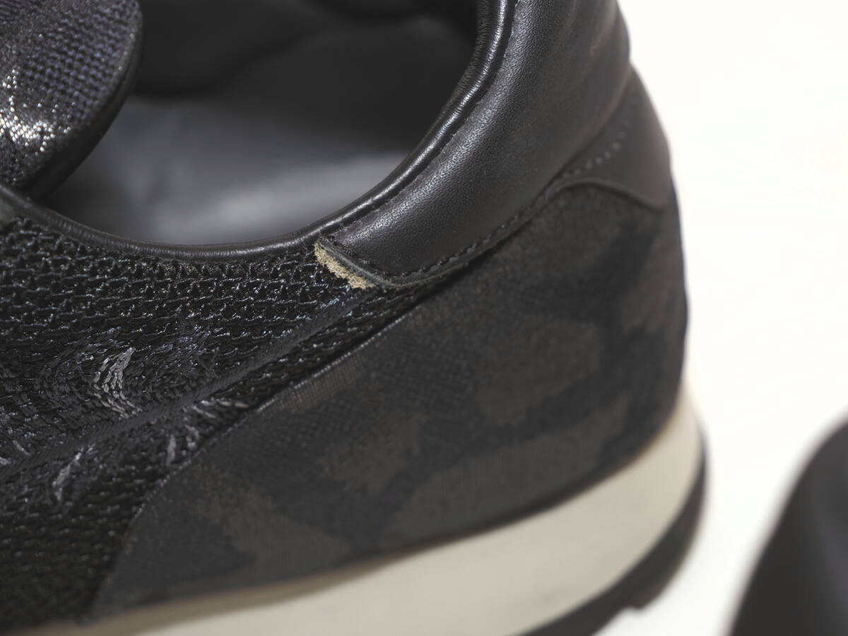 状態 B:左足ヒールのレザー部分の端に生地のはみ出しがあります。