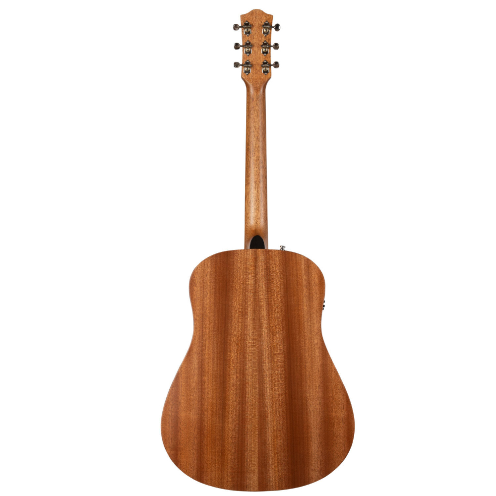 クラシックなドレッドノート形状のオールマホガニーボディとネックが、豊かで丸みのある音量と音質を提供します。
