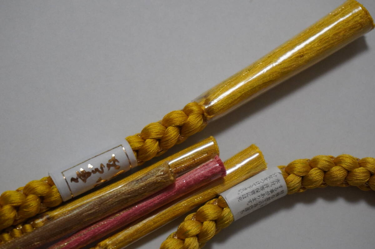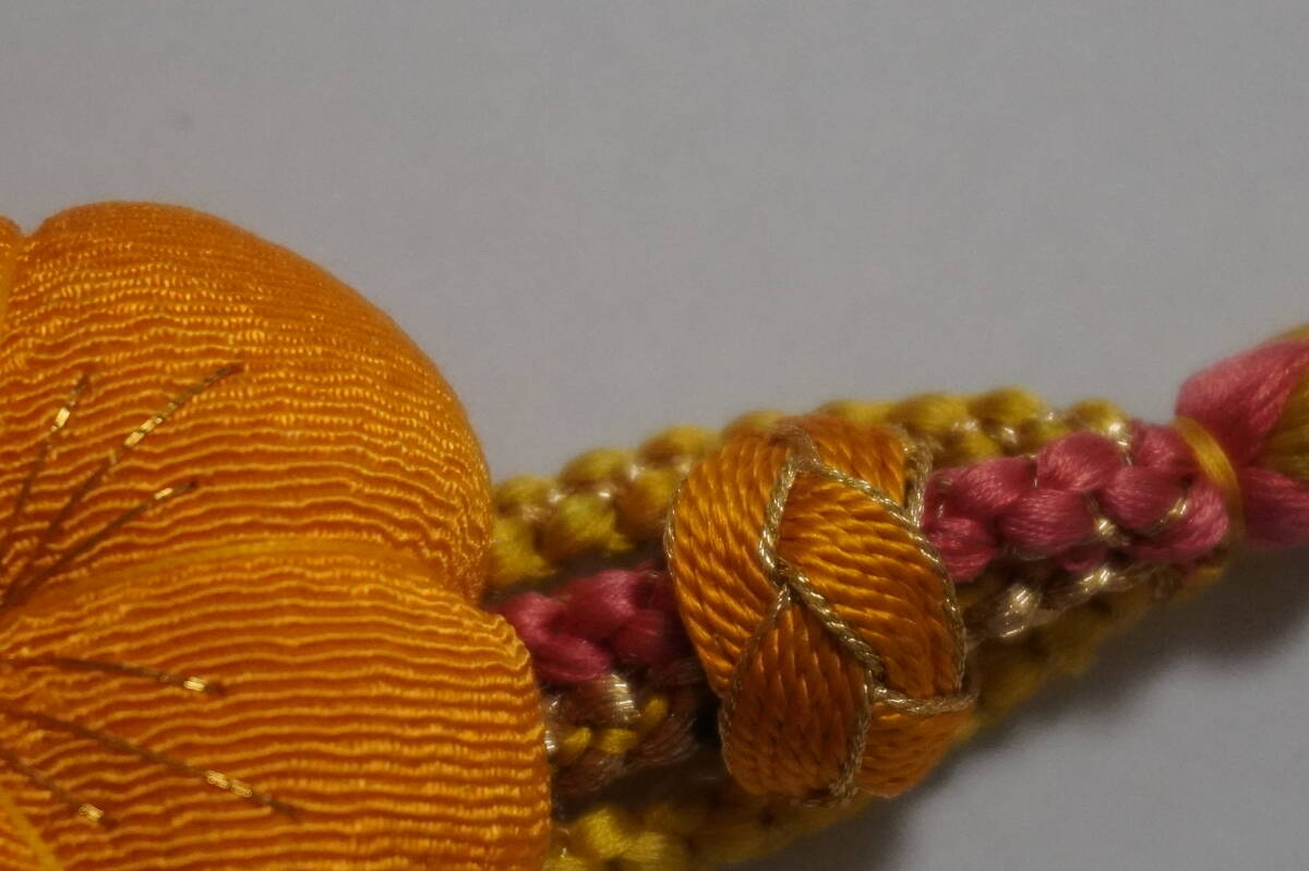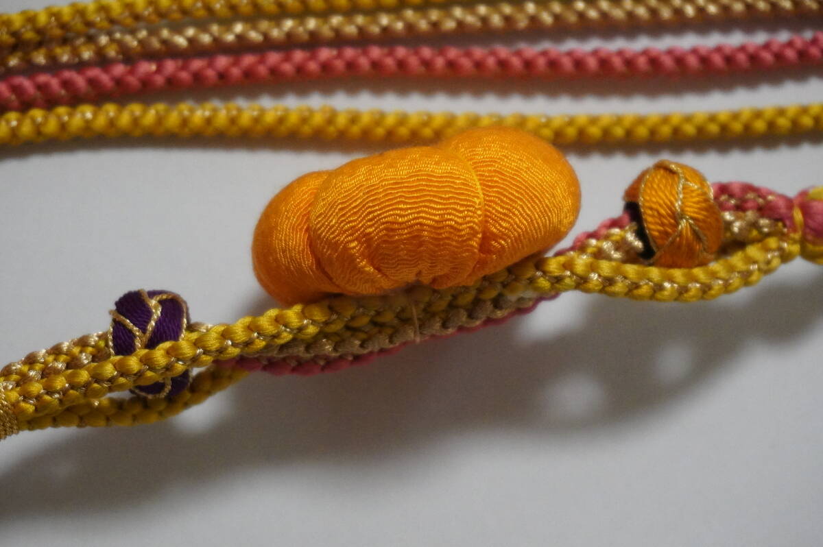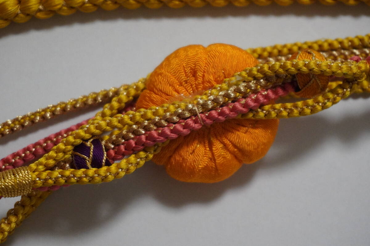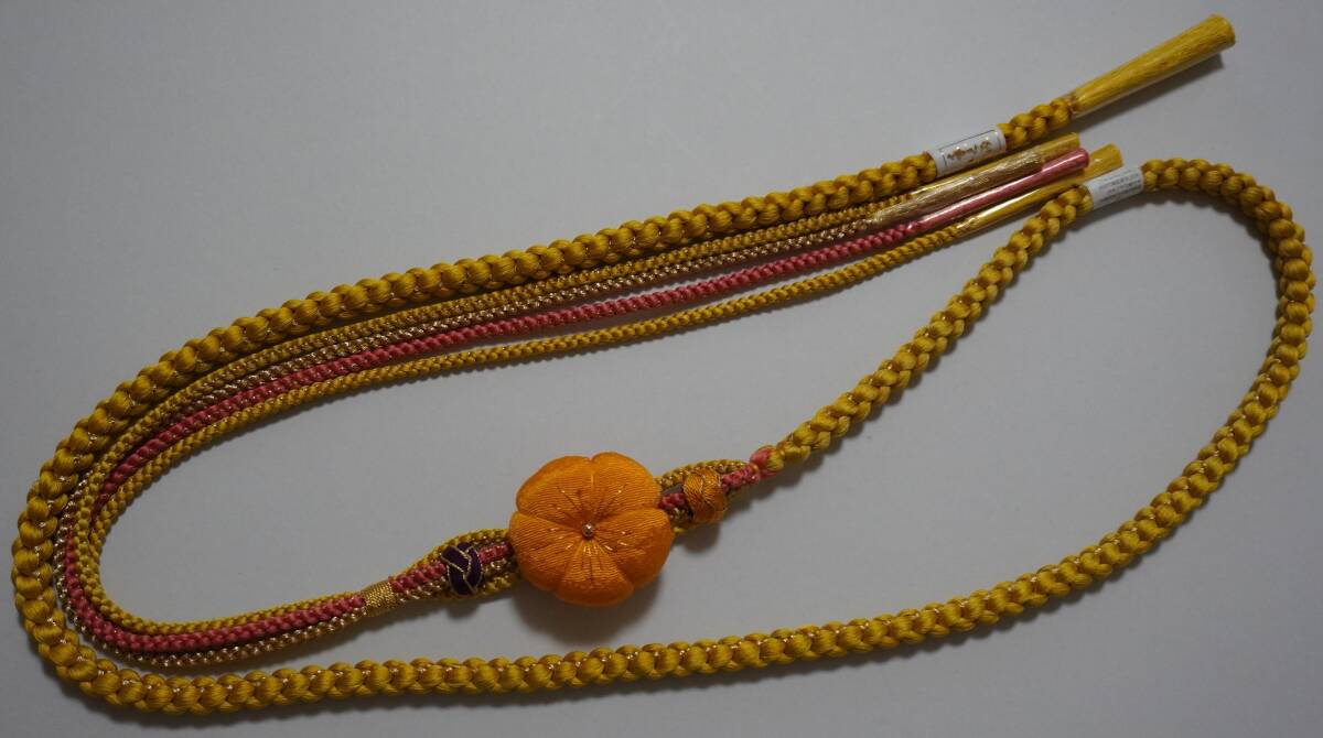 (特価)飾りつき丸帯締め 絹100%(含、金属糸使用) 飾りつき丸帯め。新品処分品。黄系色 金色糸の編みこみアリ)で途中から4本分かれ、ちりめん地で45mmの花と、飾りつき(モニターにより、濃く、または薄くっている場合などありますので心配なかたは質問をしてください)。 巾約10mm 。長さ房を入れないで約155cm(M寸表示)
