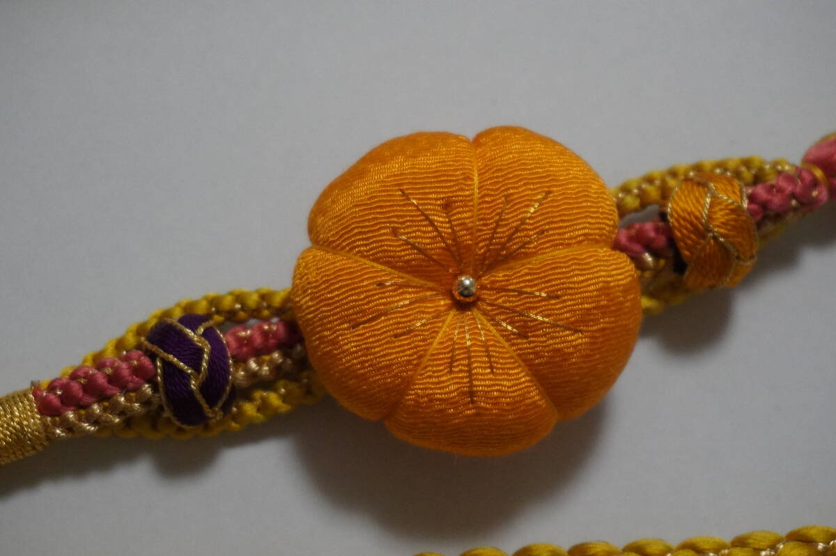 新品即決! 振袖用の飾りつき丸帯締め076(即決)浴衣着用時や髪飾りにも M表示 黄系 ちりめん地で45mmの花