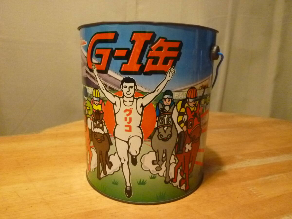 こちらはおなじみ走るポーズで有名なグリコで、そのブリキ製のお菓子缶の様でG-1缶とあり、競馬のユニークな表情の間を先頭きって走るグリコランナーが爽やかでステキです。