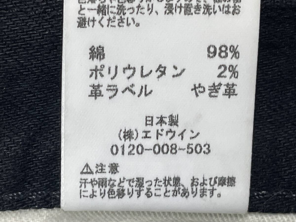 ブランド:EDWIN 型 番 :ESC32M カラー :ブラック 状 態 :USED エドウィン ESC32M セルビッチ スリム テーパード ブラックデニムパンツです。 キレイなシュルエットでEDWINのこだわりが詰まった1品です。 状態が良く色残りも良い、これから長く付き合える品です。 完売品のブラックデニムです。お探しの方お勧めの1本です。 ■サイズ:製品表記 31 ■サイズ:実寸(平置き) ウエスト 41.5cm (×2=83cm) W33相当 股下 83.5cm 股上 25.5cm ワタリ 26.5cm すそ幅 15.0cm | ||