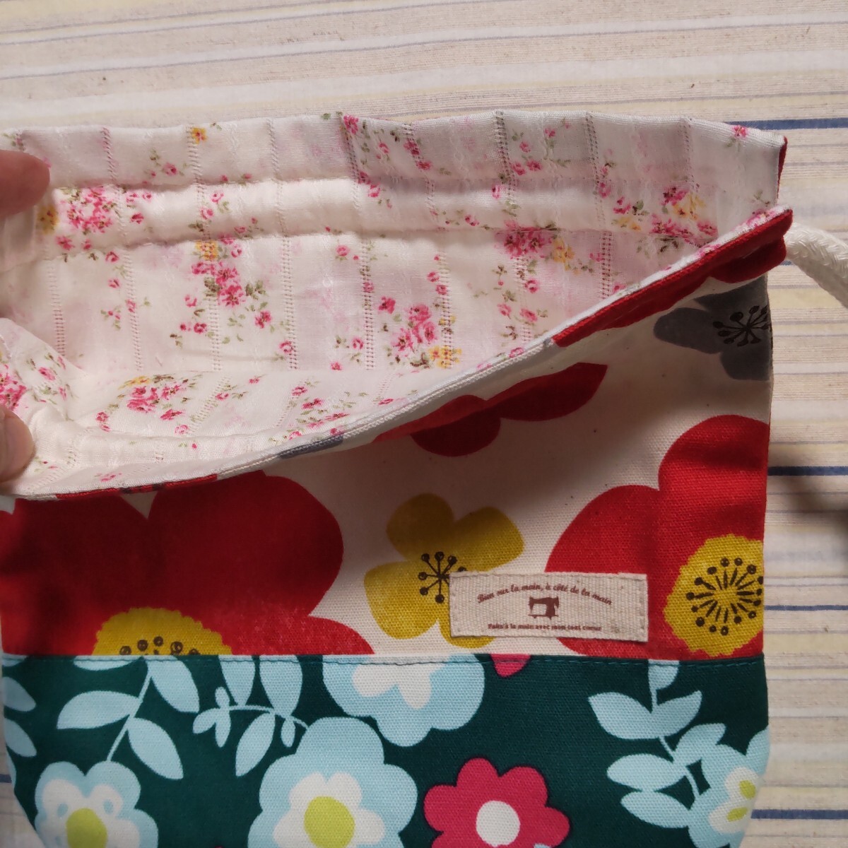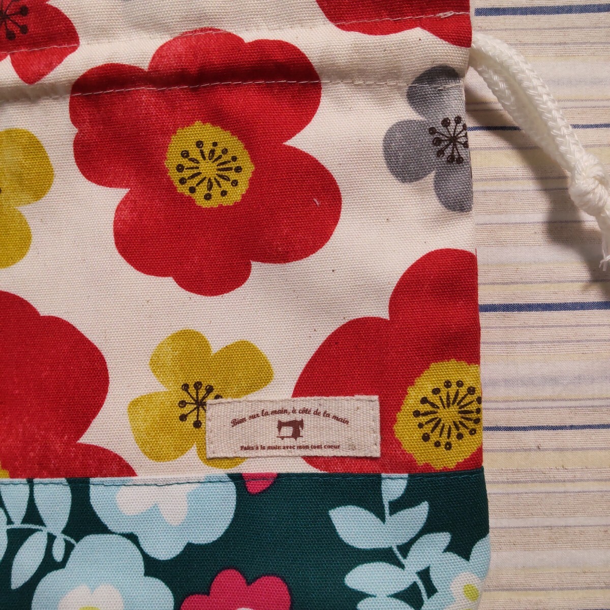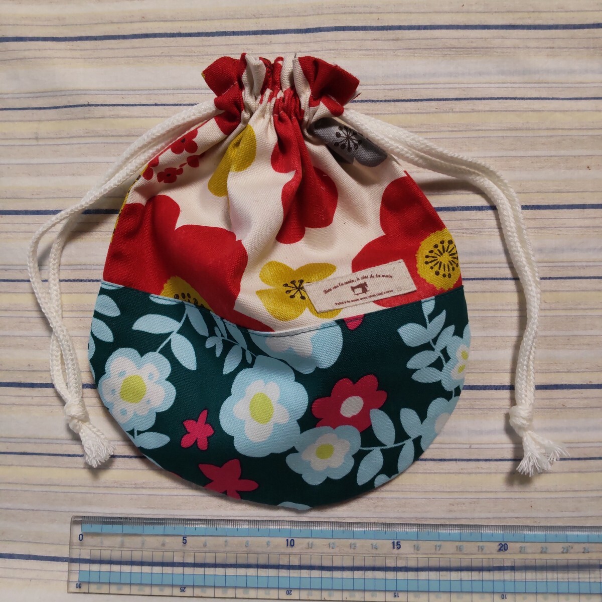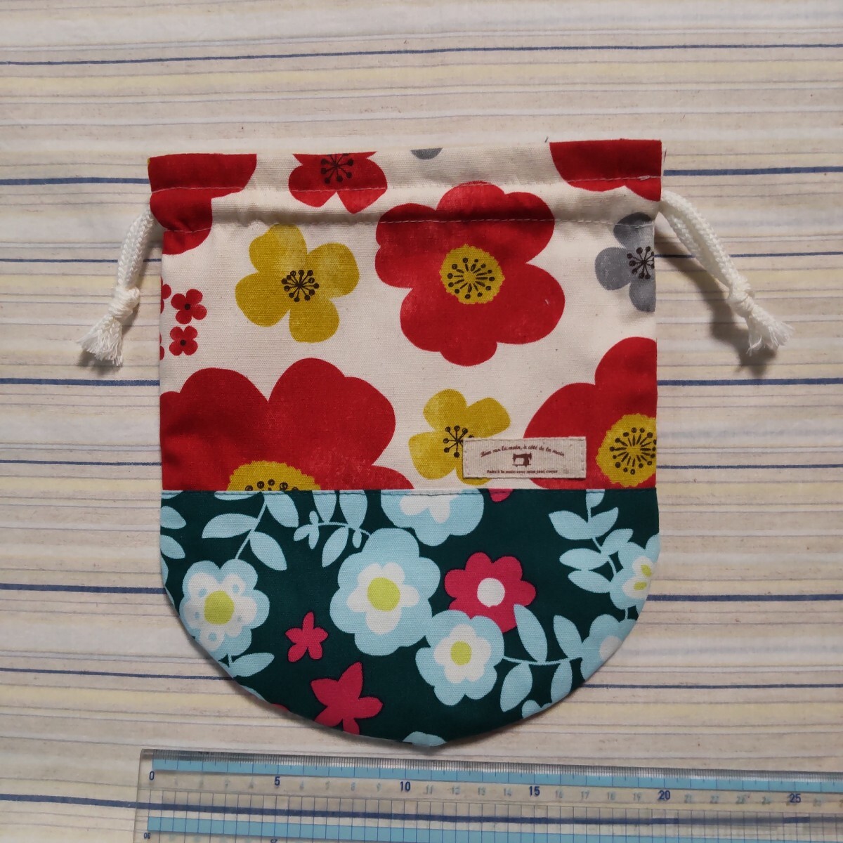 大花柄生地で作ったまんまる巾着です。 サイズはタテ23センチ、ヨコ20センチ。 生地の素材は綿オックスです。