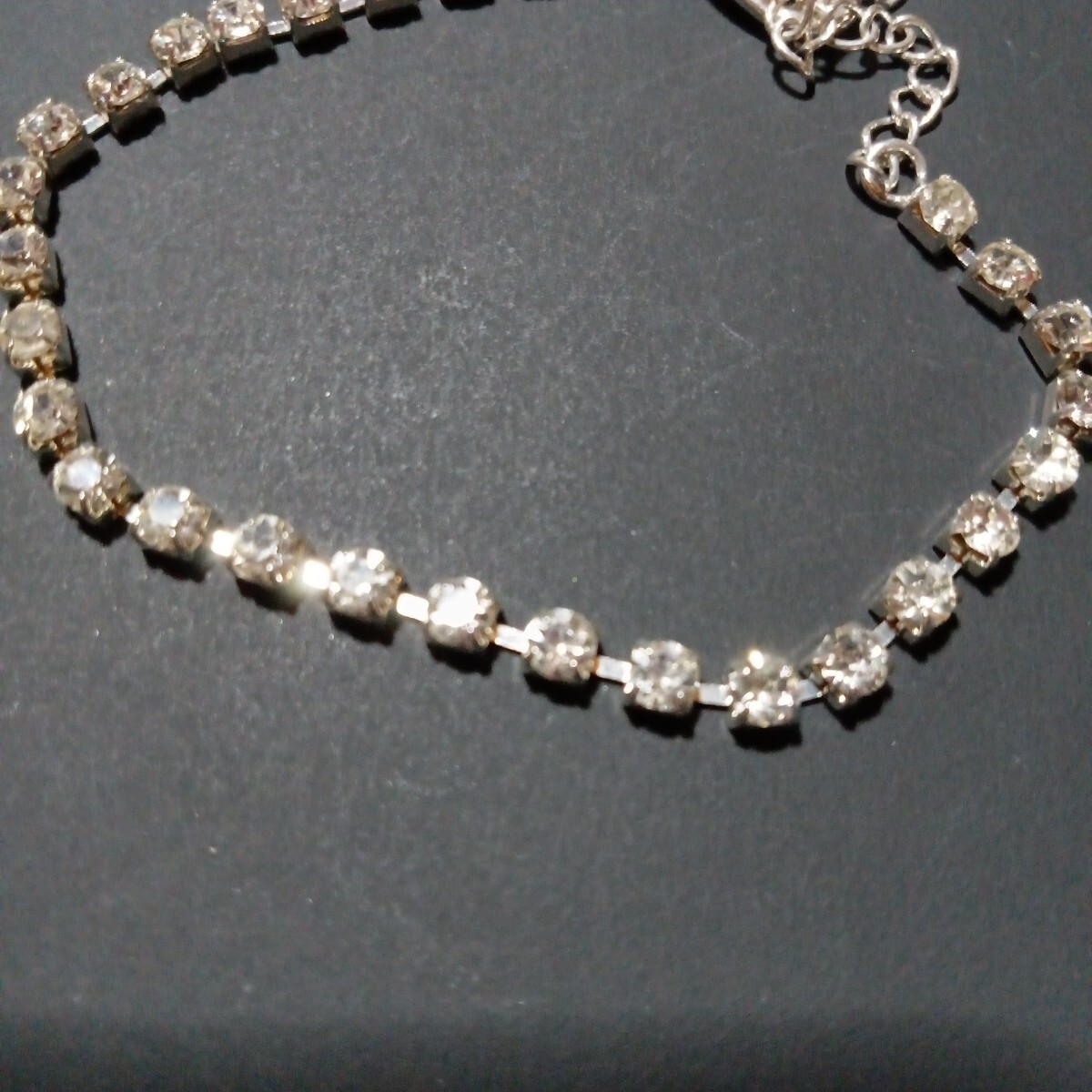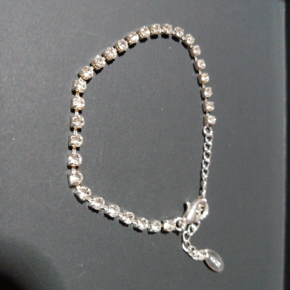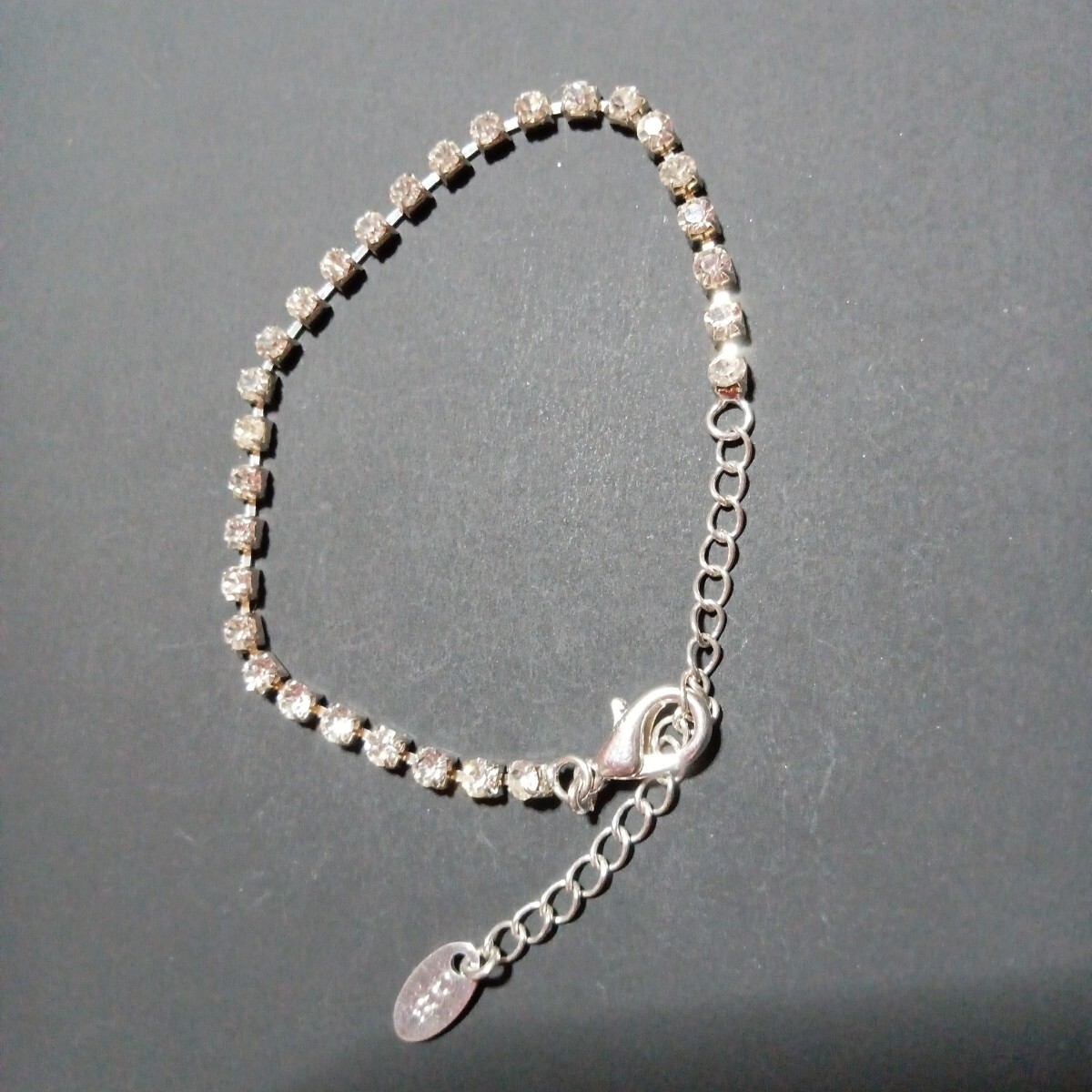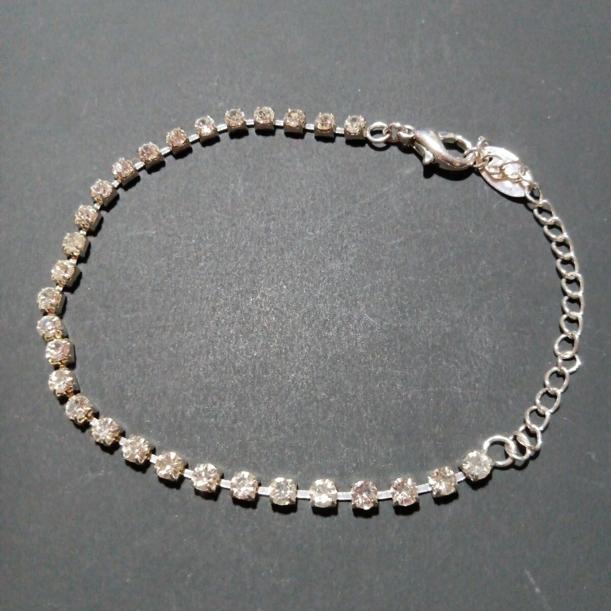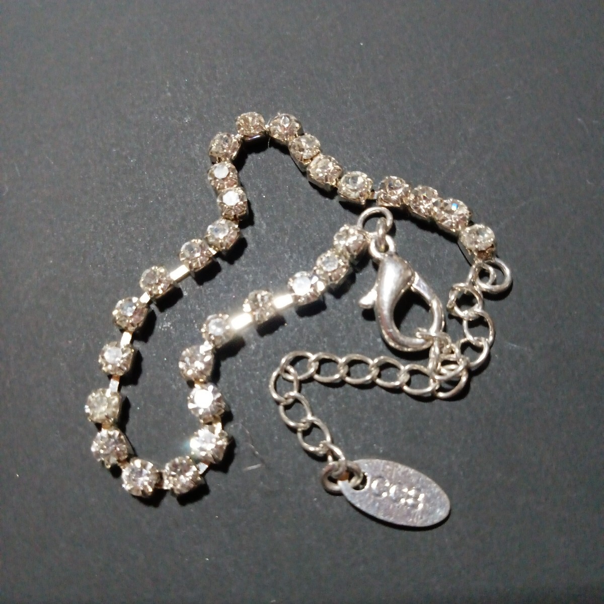 ラインストーンの輝きが美しい素敵なチェーンブレスレットです。透明度の高い上品な輝きのラインストーンがセットされており、キラキラとした輝きを放っています。手首を動かす度に、虹色の光を返してくれ、一層美しさを感じさせます。シンプルなチェーンならではの美しさが有り、単品でも素敵ですが、他のブレスレットや、リストウォッチとの重ね付けにもおすすめです。アンクレットとしてお使い頂いてもよろしいかと思います。