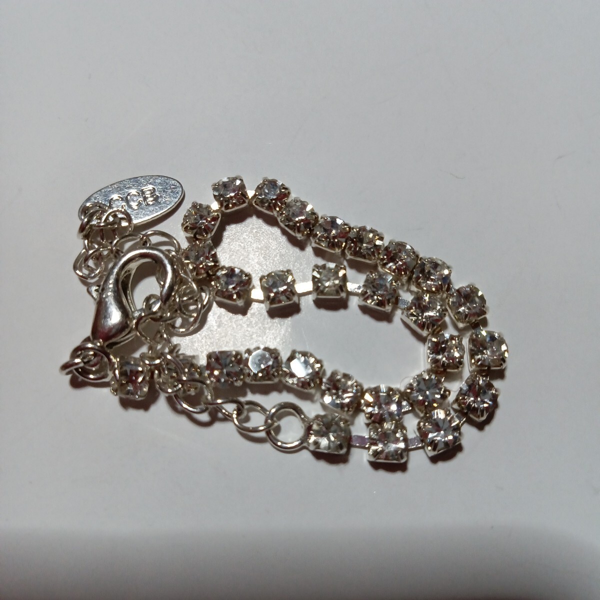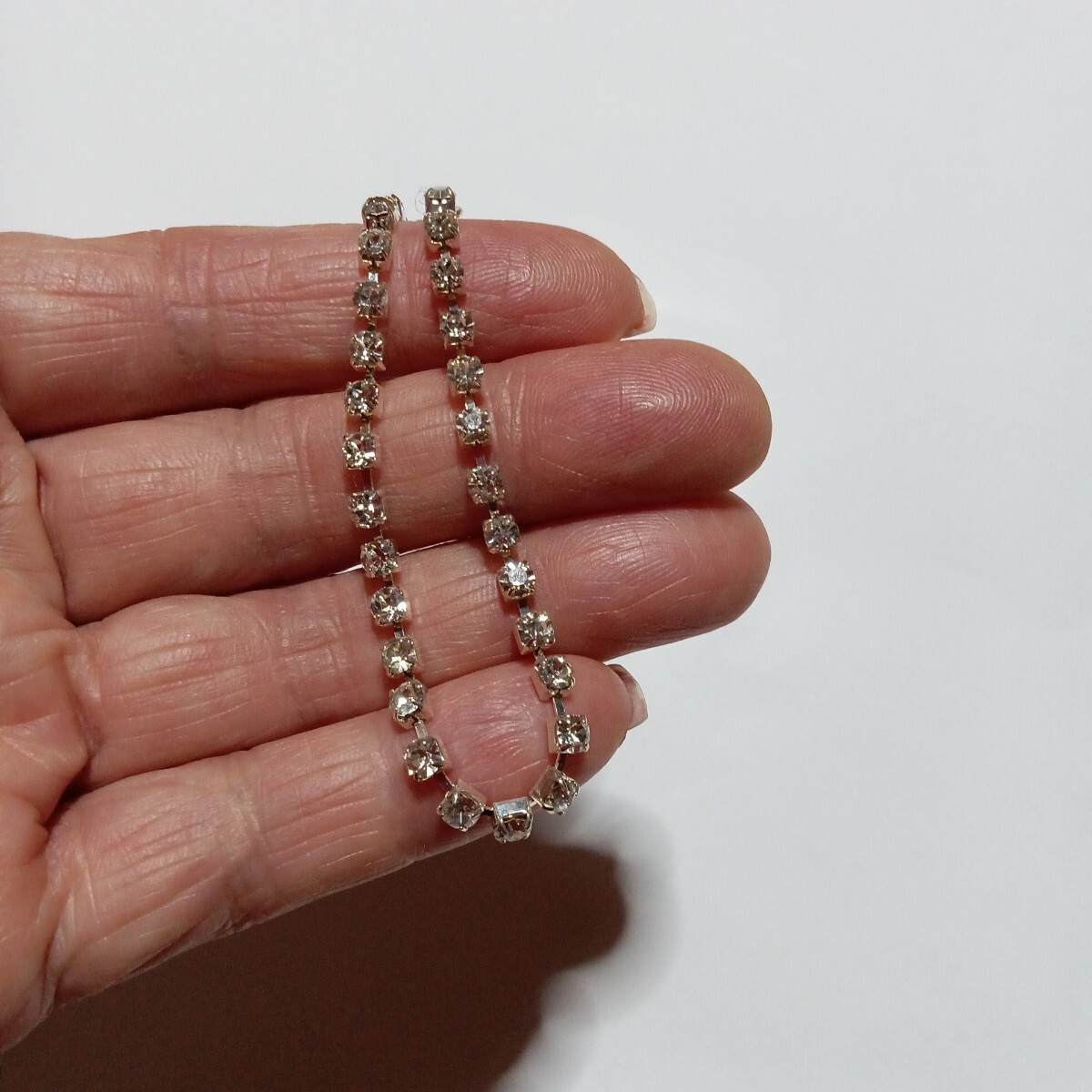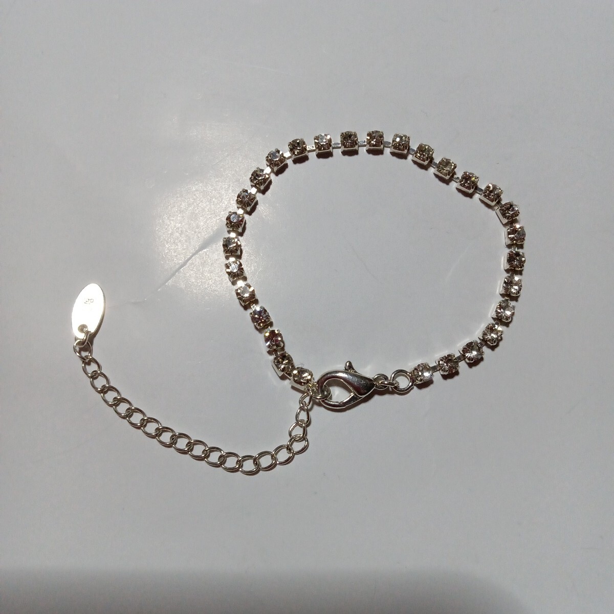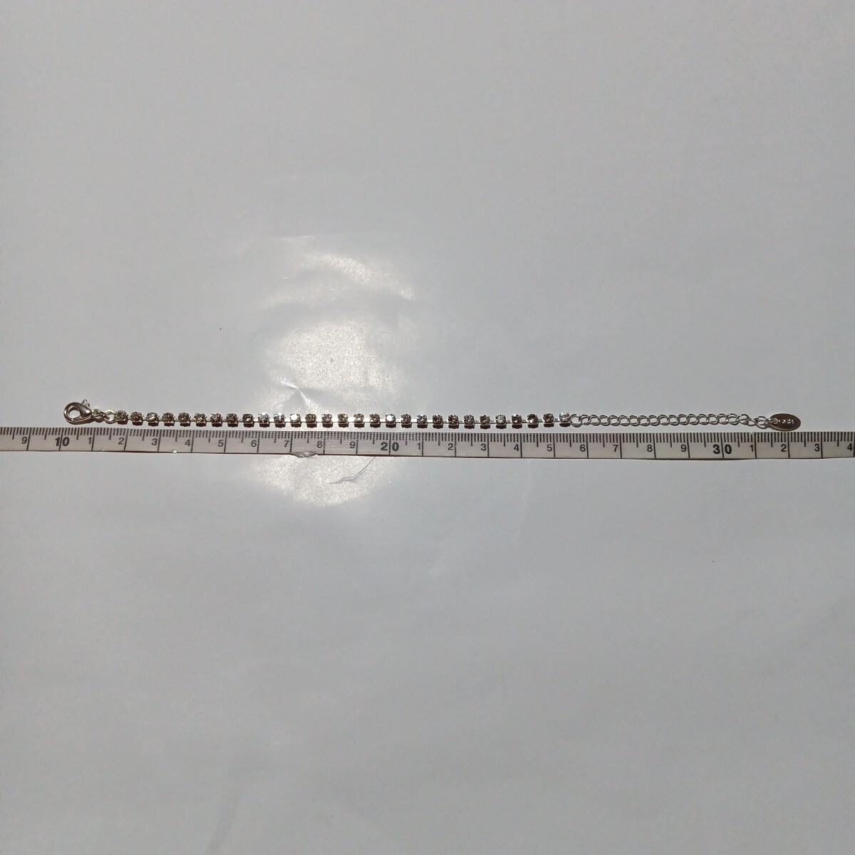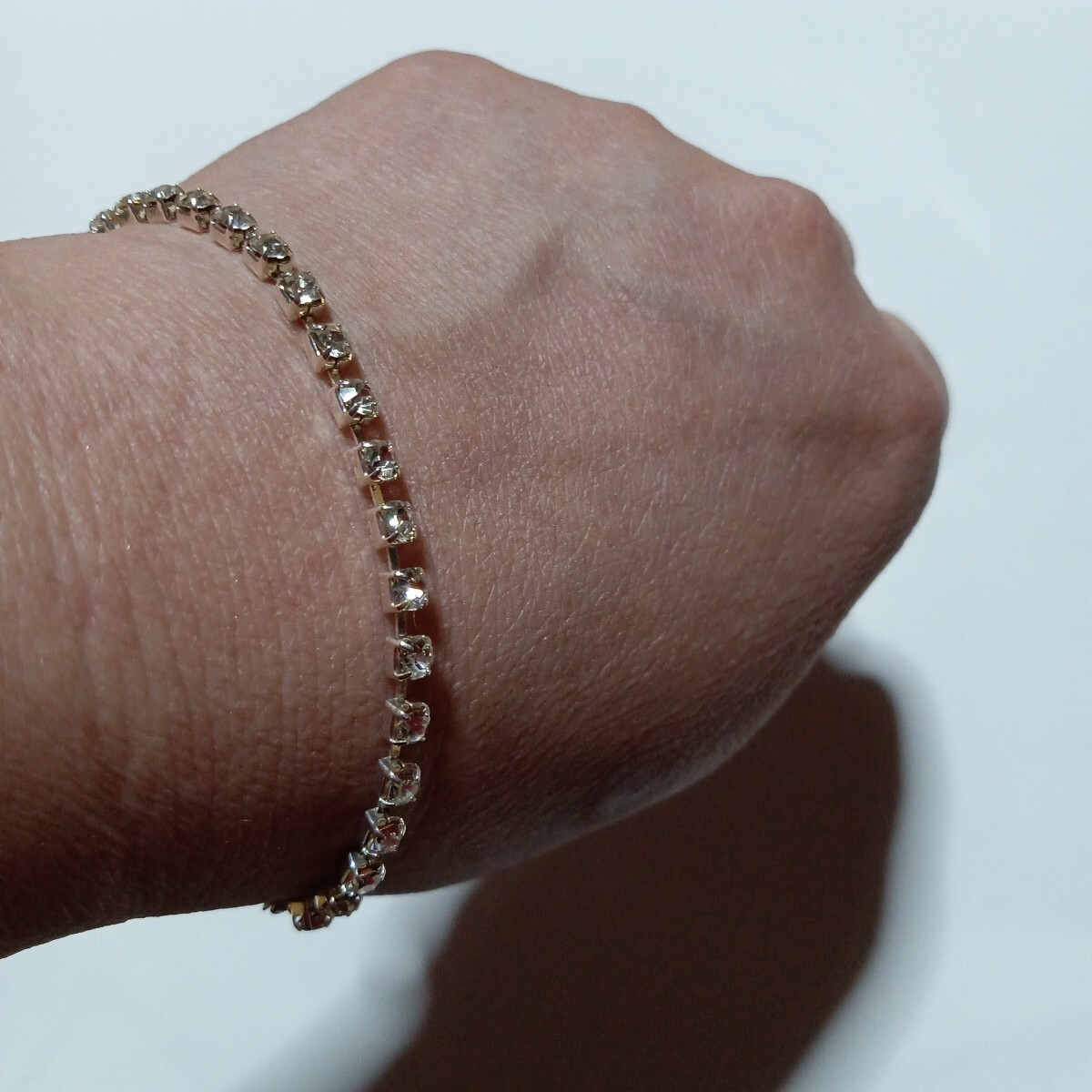 ラインストーンの輝きが美しい素敵なチェーンブレスレットです。透明度の高い上品な輝きのラインストーンがセットされており、キラキラとした輝きを放っています。手首を動かす度に、虹色の光を返してくれ、一層美しさを感じさせます。シンプルなチェーンならではの美しさが有り、単品でも素敵ですが、他のブレスレットや、リストウォッチとの重ね付けにもおすすめです。アンクレットとしてお使い頂いてもよろしいかと思います。