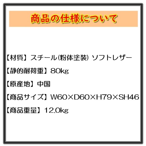 ![]() チェア CHA-51 ブラウン 商品の仕様について 【材質】スチール(粉体塗装) ソフトレザー 【静的耐荷重】80kg 【原産地】中国 【商品サイズ】W60×D60×H79×SH46 【商品重量】12.0kg ◇◆発送について◆◇