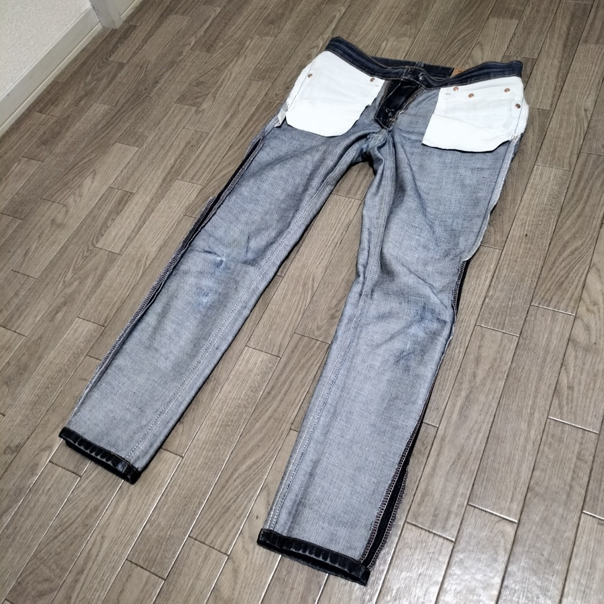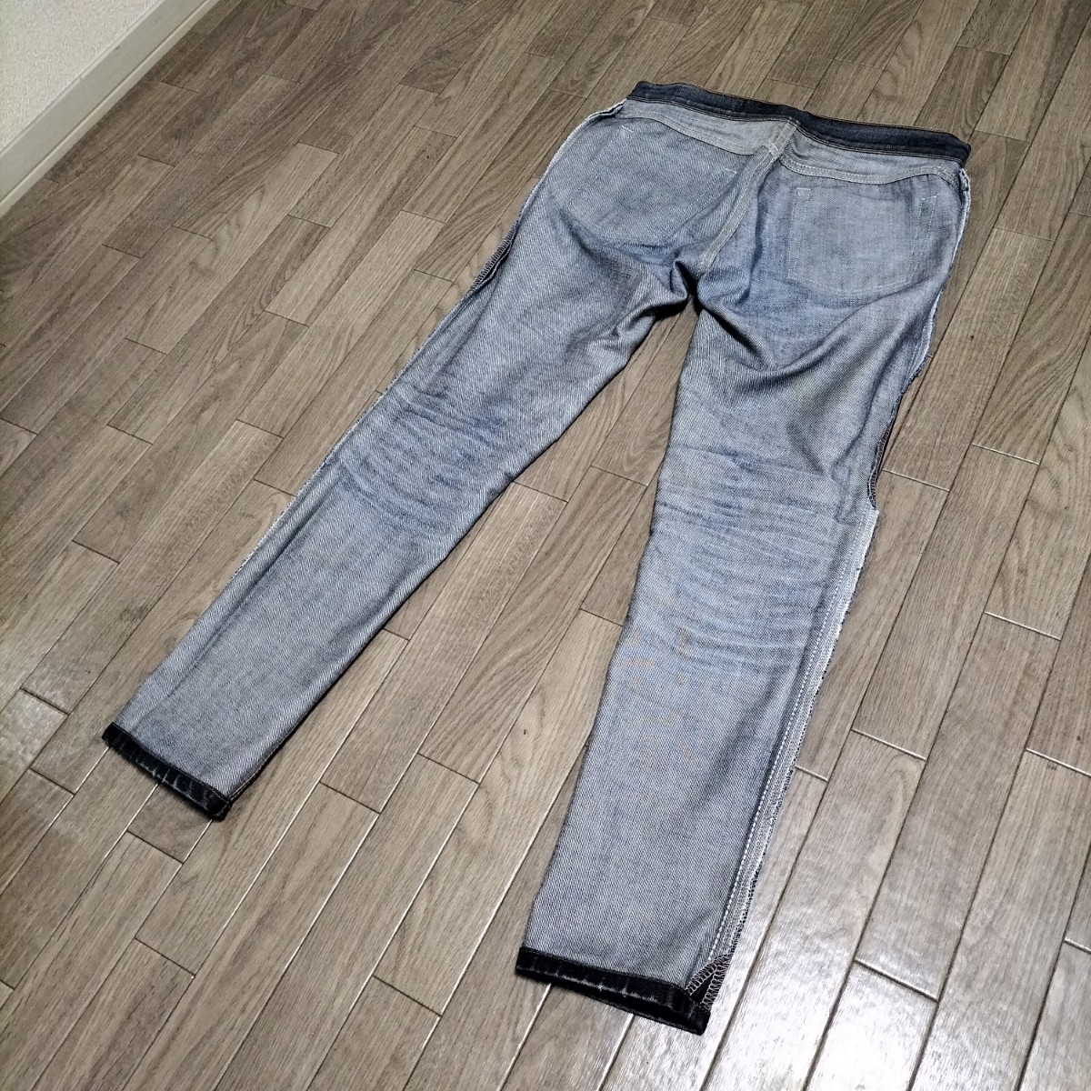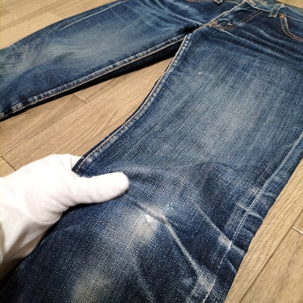 左膝部分に破れまではいきませんが、生地が薄くなっており多少のダメージが見受けられます。