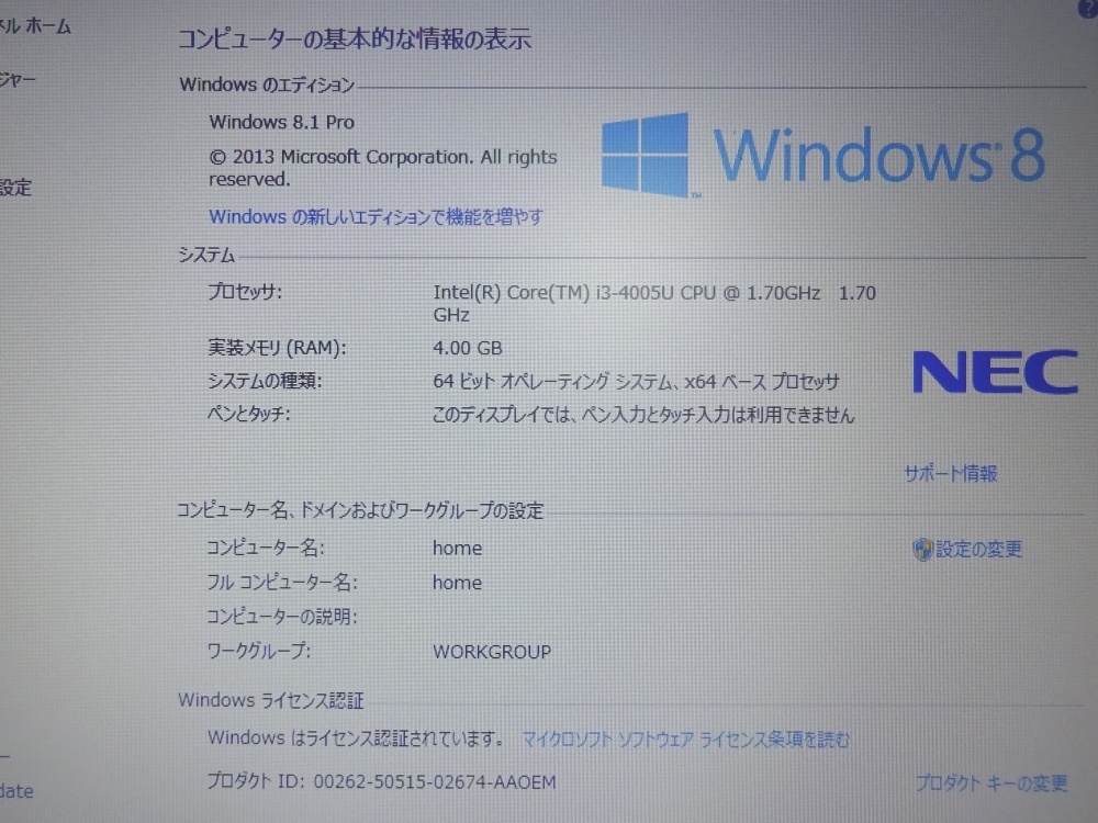 Windows 8.1 Pro Update 64ビットを再インストール済みです。