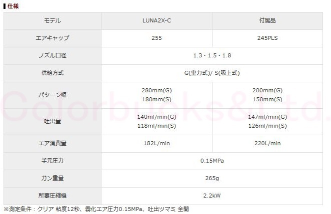 ■LUNA2X-PL (圧送式) ・ガン本体は「LUNA2i」仕様に統一。 ・ 様々な塗装に適用する霧化性能「LVMP」、フラットパターン。 ・ フルイドチップにソフトシートを埋め込み、先端からの塗料漏れを軽減 | |