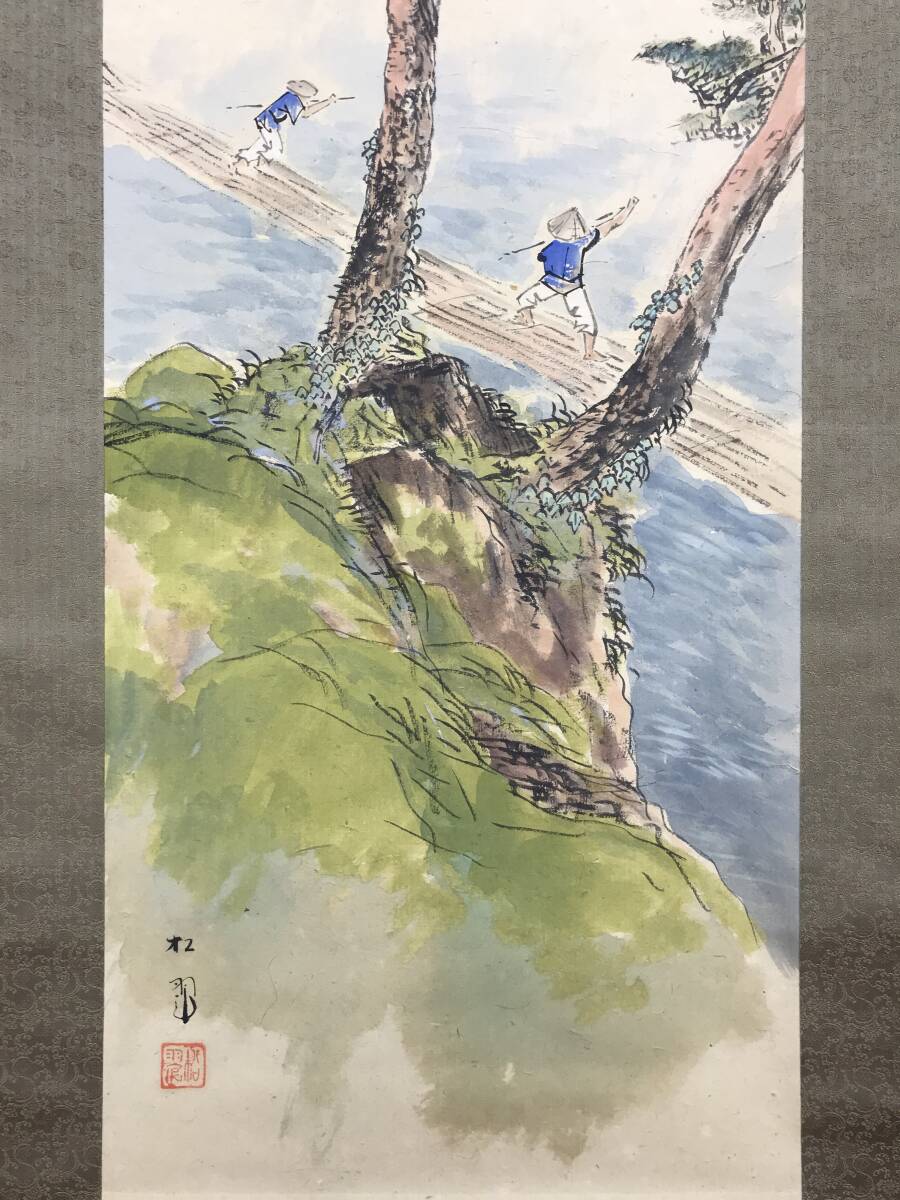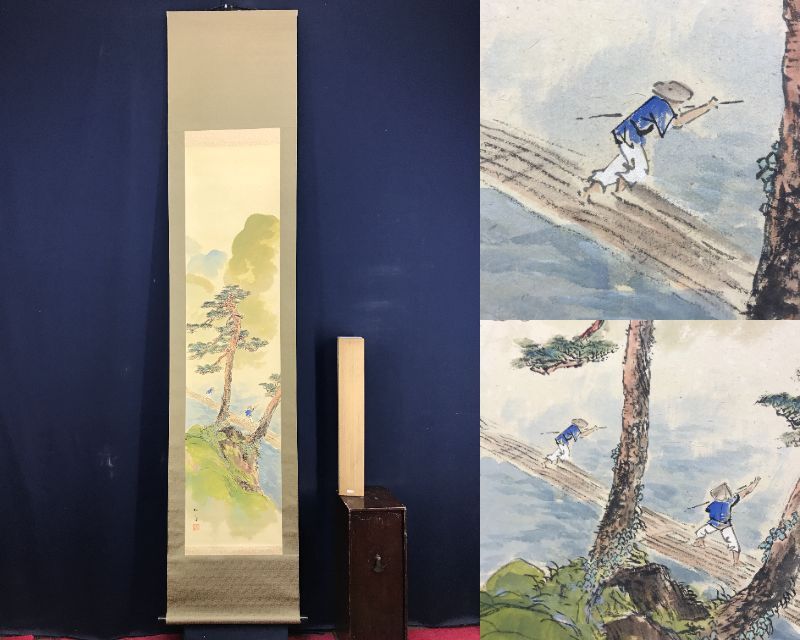 真作/松翠/筏流し夏/山水図/保津川下り図/嵐山山水図/掛軸☆宝船☆AE-488