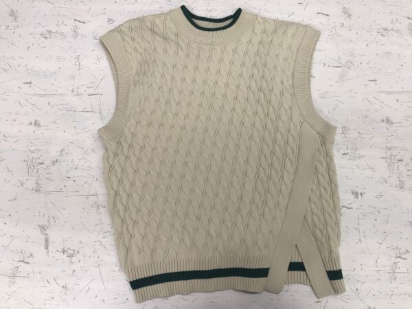 エヌプラス N+ ニトリ トリミング ケーブル編み ニットベスト レディース ポリエステル100% スリット F ベージュ/緑 です。
