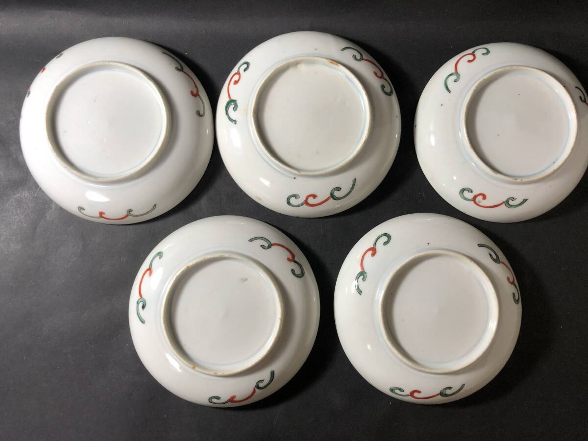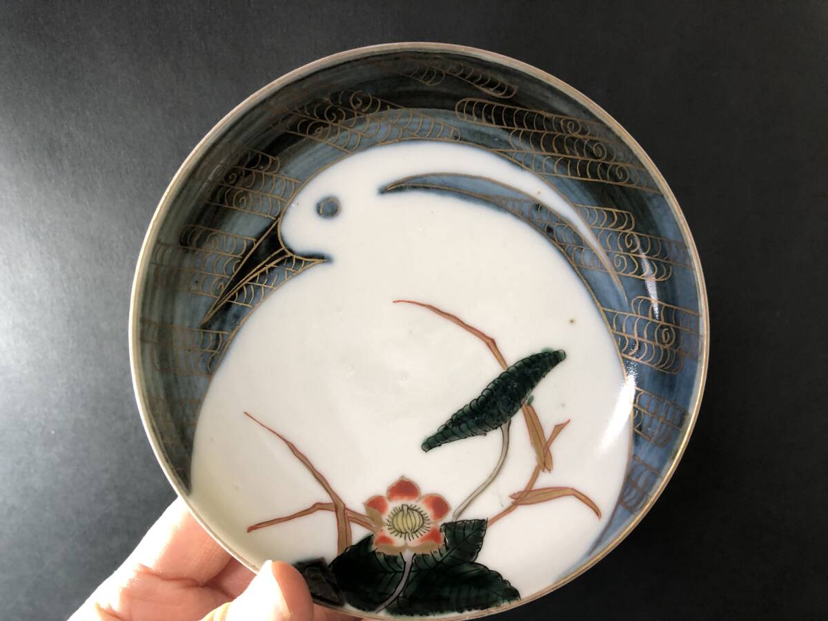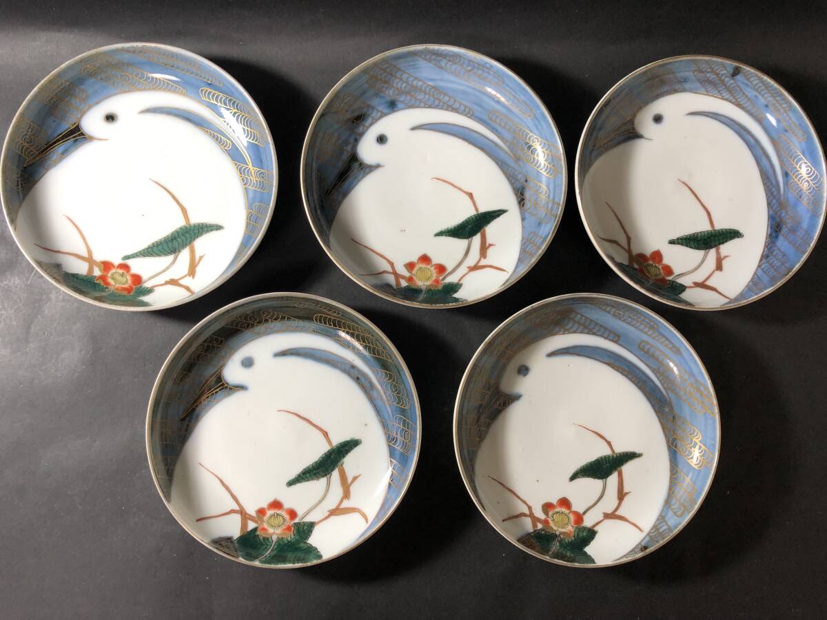 古伊万里 染錦 小皿 豆皿 モダン!白鷺に花文様 五枚 古伊万里 九谷焼 骨董雑貨 和食器 テーブルコーディネート
